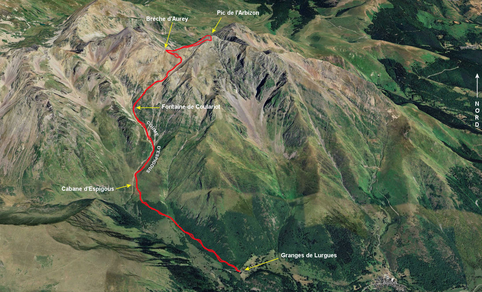 Du parking des granges de Lurgues, prendre la direction « ARBIZON – AULOUEILH ». À environ 1,3 kilomètre, laisser le sentier d’Auloueilh sur la gauche pour continuer vers l’Arbizon. Quelques minutes plus tard on arrive à la cabane d’Espigous à partir de laquelle on rentre dans la Coume d’Espigous, la remonter jusqu’à la fontaine de Coulariot. Suit un passage redressé où l’aide des mains est utile, quelques pas de I, pour déboucher sur un grand pierrier qu’on remonte sans difficulté jusqu’aux abords de la brèche d’Aurey. Suivre l’arête finale vers la droite pour finir de monter au sommet du Pic de l’Arbizon.