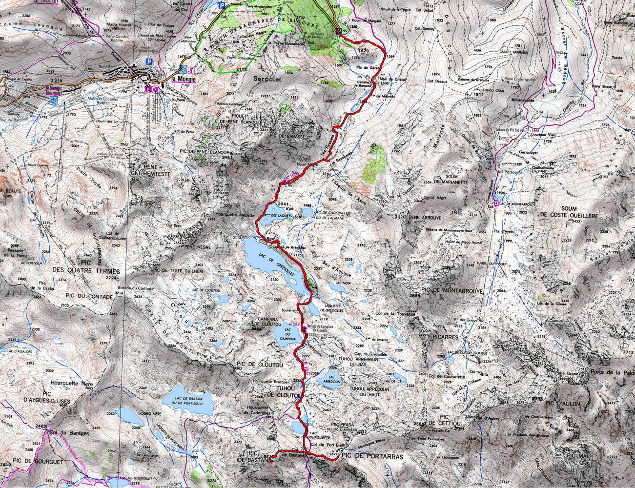 Parking du Garet 1430 m - Barrage des Laquets 2041 m - Lac de Gréziolles 2113 m - Refuge de Campana de Cloutou 2215 m - Lac de la Hourquette 2405 - Col de Bastanet 2507 m - Pic de Bastan 2718 m -