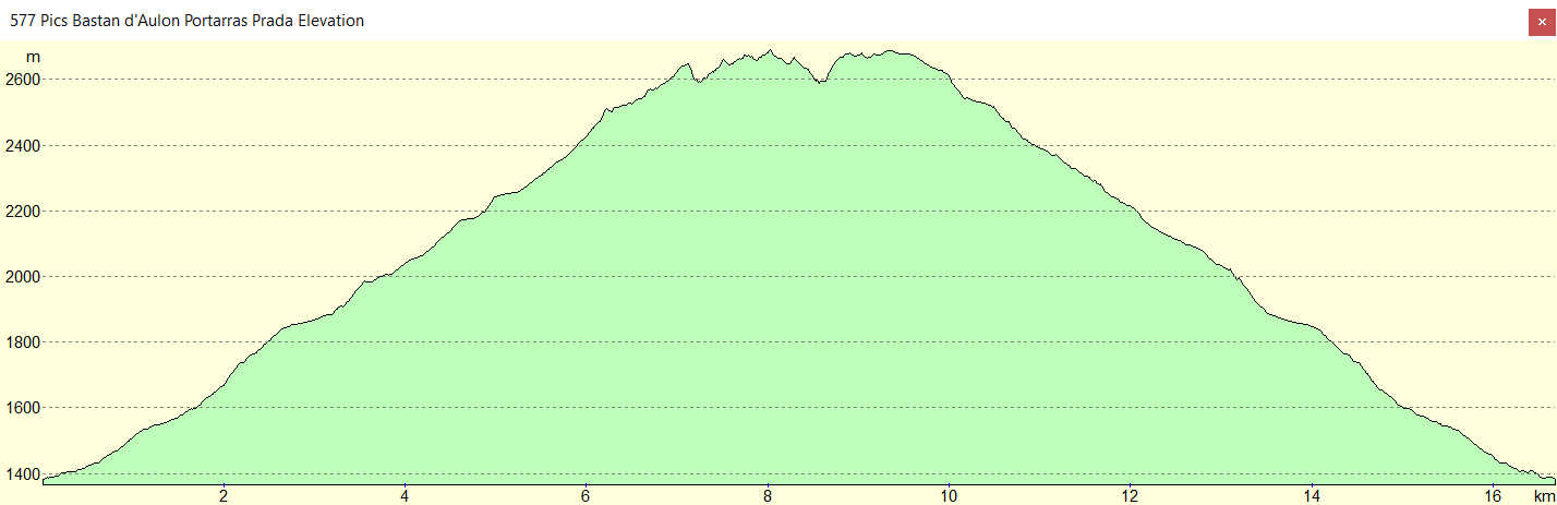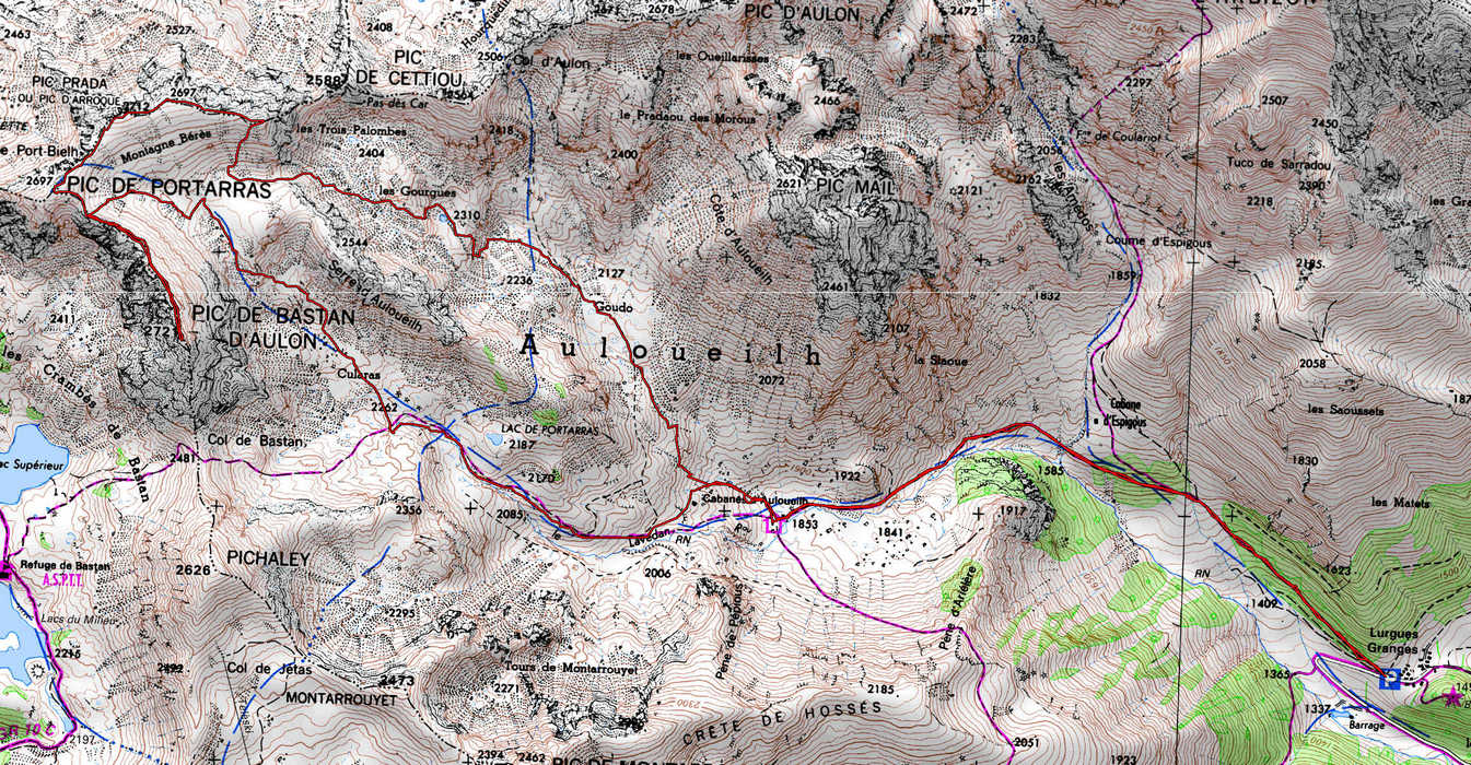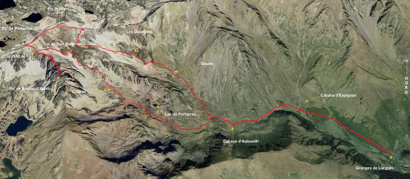 Granges de Lurgues 1400 m - Cabane d'Auloueilh 1853 m - Cularas 2300 m - Col 2650 m - Pic de Bastan d'Aulon 2721 m - Col 2650 m - Pic de Portarras 2697 m - Col de Port Bieilh 2660 m -