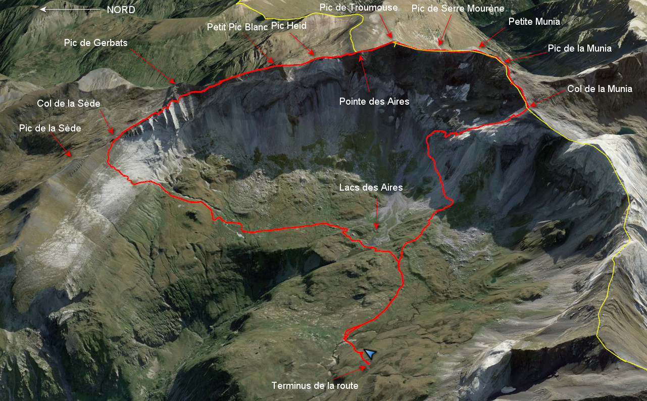 Parking Cirque 2080 m - Lac des Aires 2089 m - Col de la Sede 2651 m - Petit Pic Blanc 2957 - Pic Heid 3022 m - Pointe des Aires 3028 m - Pic de Troumouse 3085 m - Pic de Serre Mourene 3090 m -