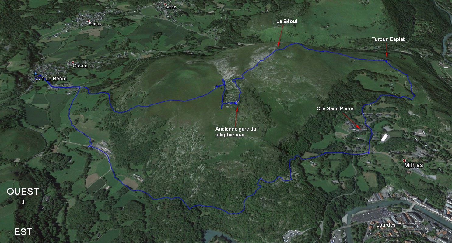 De la gare continuer toujours par le même chemin pour monter au sommet du Béout, pour le traverser et descendre vers le Nord sur un col et le Turoun Esplat. Encore quelques centaines de mètres vers le Nord et le chemin tourne sur la droite pour revenir vers le Sud et descendre vers le Cité Saint Pierre. Traverser la Cité Saint Pierre. A sa sortie la route partant sur la gauche amène à Lourdes ne pas la prendre. Pour revenir vers Ossen prendre à droite, quand la route tourne à gauche, prendre en face la piste qui longe un petit lac, traverser le terrain du club de trial de Lourdes et continuer toujours vers le Sud jusqu’à parvenir au GR 101 qui correspond au chemin du Caouchiou. Prendre à droite et suivre ce chemin balisé jusqu’à revenir à Ossen.