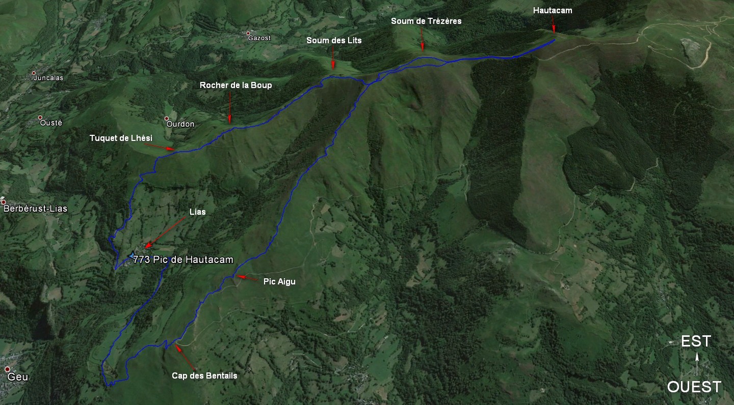 Du parking dans le hameau de Lias revenir sur la route jusqu’à la croix, 200 m environ. Prendre le chemin sur la droite et monter jusqu’à la crête, par une série de sentiers plus ou moins bien visible en gardant le plus possible une direction est. Une fois parvenue à la crête, la suivre vers la droite, jusqu’au pic de Hautacam en passant par le Tuquet de Lhési, les Rochers de la Boup, le Soum det Lits, le Soum de Trézères.