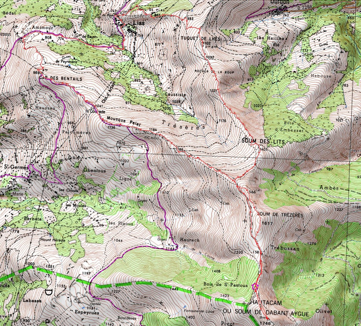 Lias 745 m - Croix du Poey 745 m - Tuquet de Lhési 1104 m - Rocher de la Boup 1125 m - Soum des Lits 1407 m - Soum des Trézères 1617 m - Hautacam 1746 m - Pic Aigu 1184 m -