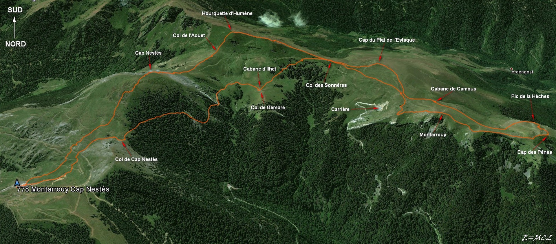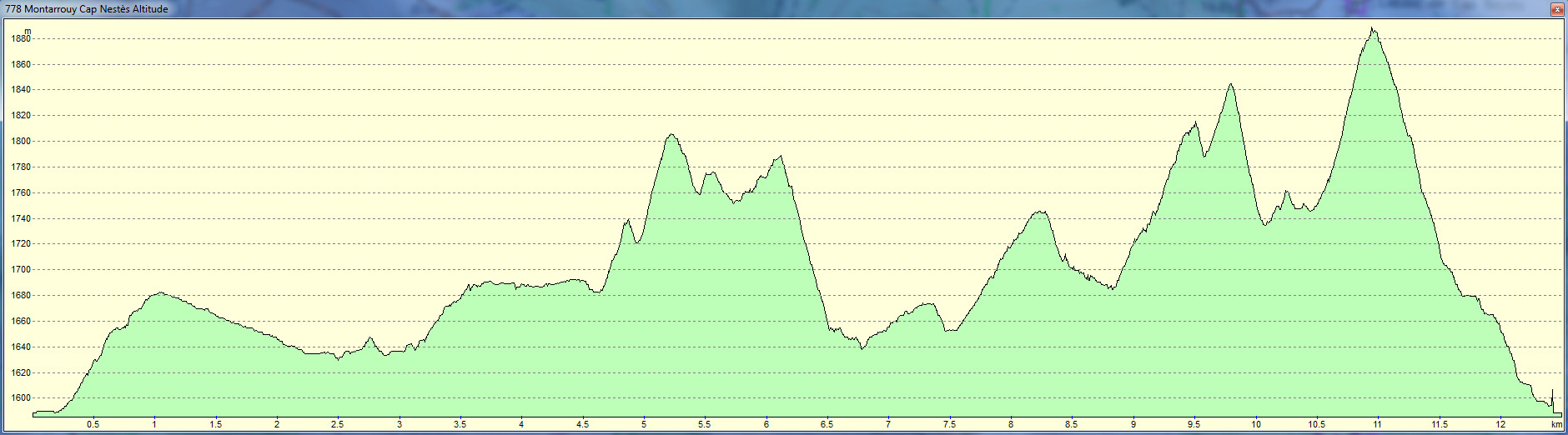 Parking Station de Nistos 1590 m - Col du Cap Nestès 1685 m - Col de Gembre 1640 m - Col de Sonères 1685 m - Col 1680 m - Sommet 1736 m - Col 1721 m - Montarrouy 1805 m - Col 1758 m - Sommet 1777 m -