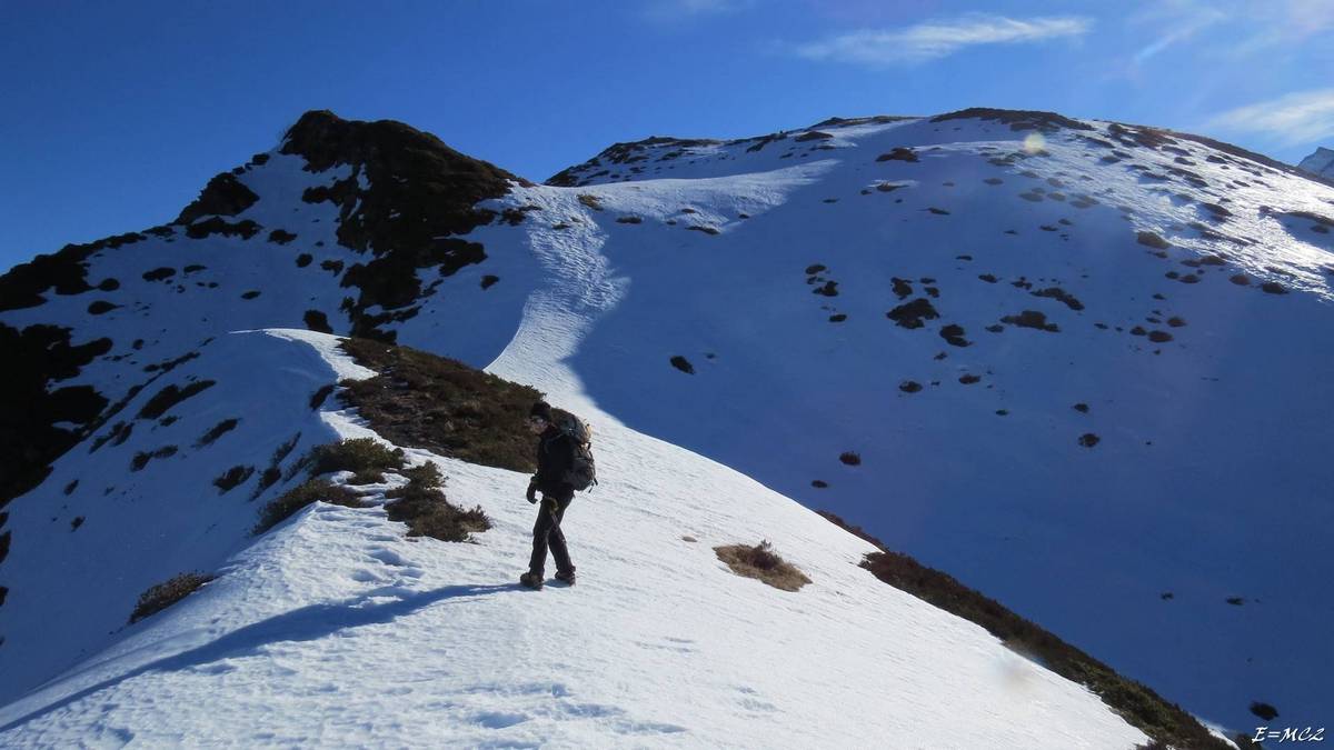 Commencer à monter dans la pente nord du Soum de Siarrousse en appuyant progressivement à droite en cherchant l’amorce du sentier qui mène à la Hourquette Neuve sur la crête nord-ouest du Soum de Siarrousse. La ligne générale de ce sentier était visible depuis le flanc opposé pendant l’approche grâce à la neige. En le parcourant il est moins évident. Une partie raide est équipée d’une main courante (câble). Sur la fin de l’approche de la Hourquette Neuve, nous avons perdu le sentier recouvert par la neige. Une fois parvenus sur la crête la fin de l‘ascension ne présente plus de problème.