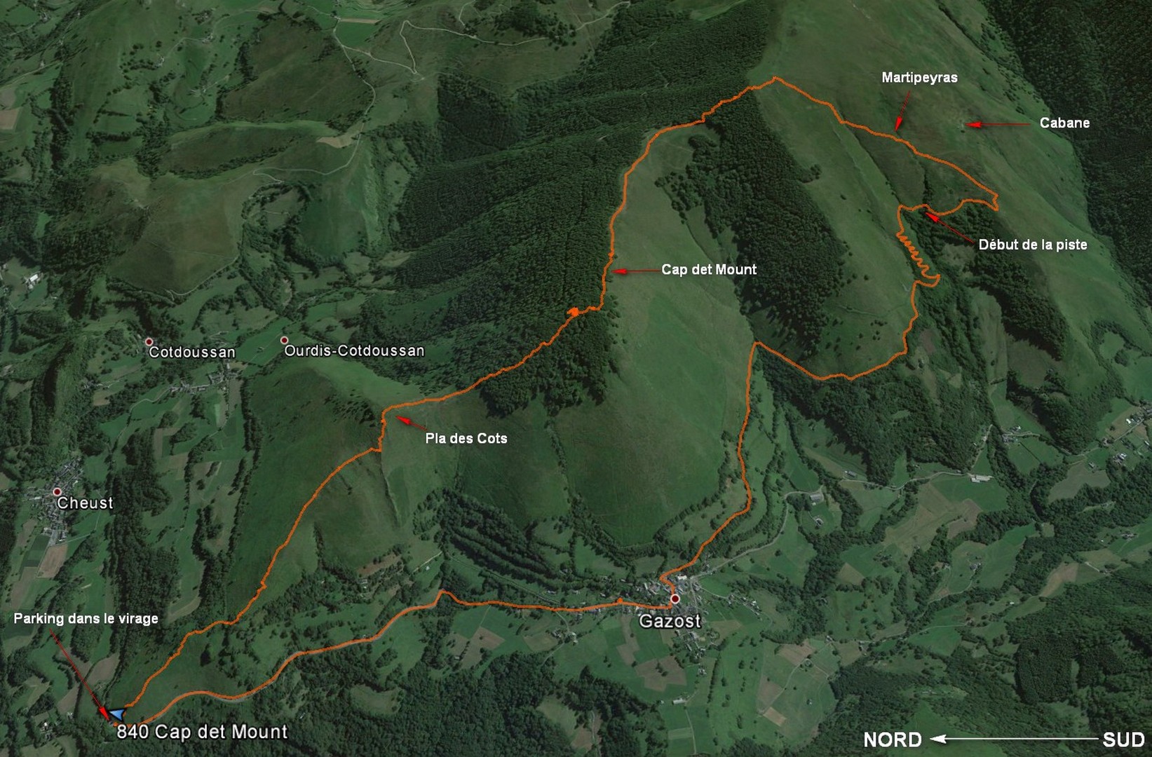 Du parking dans le virage*, attaquer directement la crête au mieux pour la suivre sur son fil quasiment tout le temps sans difficulté. Une heure de marche est nécessaire pour parvenir au Pla des Cots (borne). Toujours en suivant la crête, passer le petit col et se diriger vers le Bois de Lapart. Monter tout droit, assez raide mais bon terrain et propre quand nous y sommes passés. Une fois sorti du bois suivre la lisière vers le sud-est, et obliquer à droite pour suivre la piste sur 300 mètres environ et la quitter sur la gauche pour monter directement dans le bois. A la sortie du bois vers 1380 m d’altitude tourner à droite, sud-ouest, dans les pentes d’herbe jusqu’à rejoindre un assez bon sentier et repérer en contre bas la piste qu’il faut rejoindre pour descendre sur Gazost (1h). De Gazost une petite demi-heure de plus pour revenir au parking par la route.