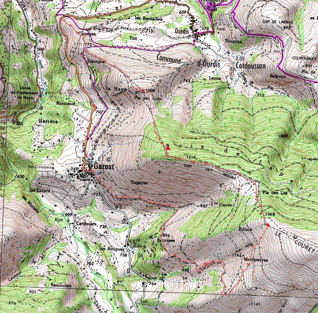 Parking virage 650 m - Pla des Cots 1008 m - Col 985 m - Cap det Mount 1219 m - Crête du Couret 1383 m - Gazost 769 m - Parking virage 650 m