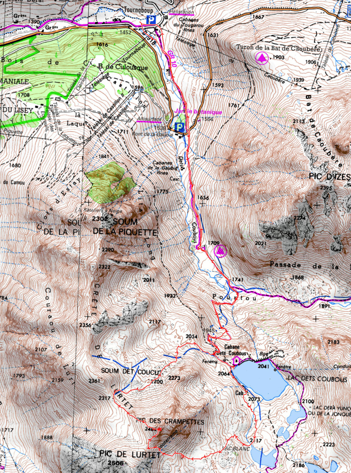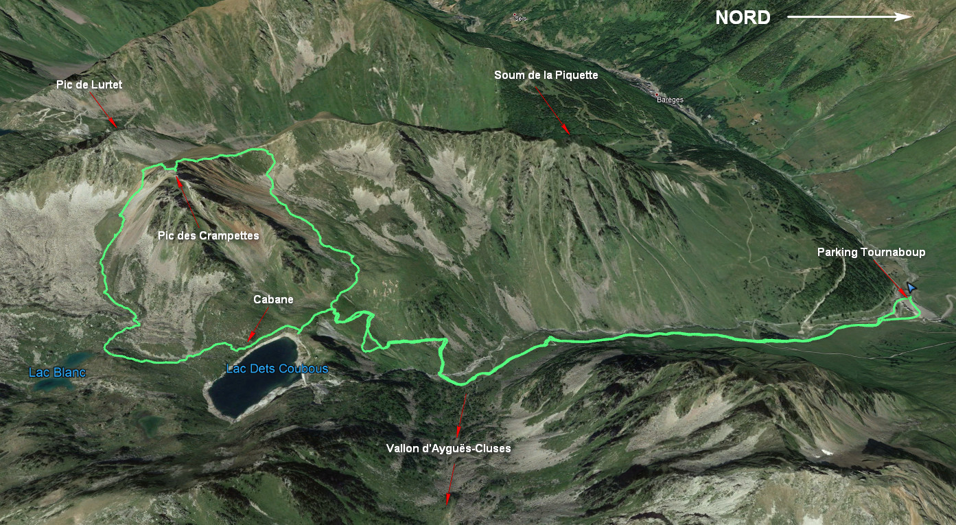 Tournaboup 1455 m - Bifurcation 1750 m - Lac dets Coubous 2040 m - Col 2400 m - Pic des Crampettes 2484 m - Col 2317 m - Chemin dets Coubous 2030 m - Tournaboup 1455 m