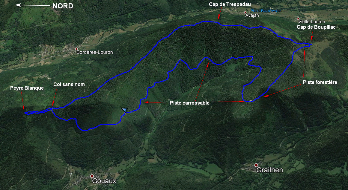 Commencer le parcours en prenant la piste carrossable, vers le nord, après avoir fait 600 mètres prendre la piste qui monte sur la droite vers un col qui ne porte pas de nom. Depuis ce col on peut faire un aller et retour au sommet de Peyre Blanque, 400 mètres au nord. Du col, laisser le chemin repéré par un sens interdit pour prendre la piste forestière remontant le Pla de la Coume Sourde repéré par une interdiction de circulation. Conserver la crête jusqu’au Cap de Boupillac sans difficulté. Du Cap de Boupillac repéré par une borne, suivre la piste vers le nord-ouest. Elle suit la crête séparant les Bois d’Artigaus sur la droite et de Cassayt sur la gauche. Herbeuse au début elle devient terreuse pour finir par une grande plateforme à partir de laquelle on continue par la piste carrossable ramenant au point de départ.