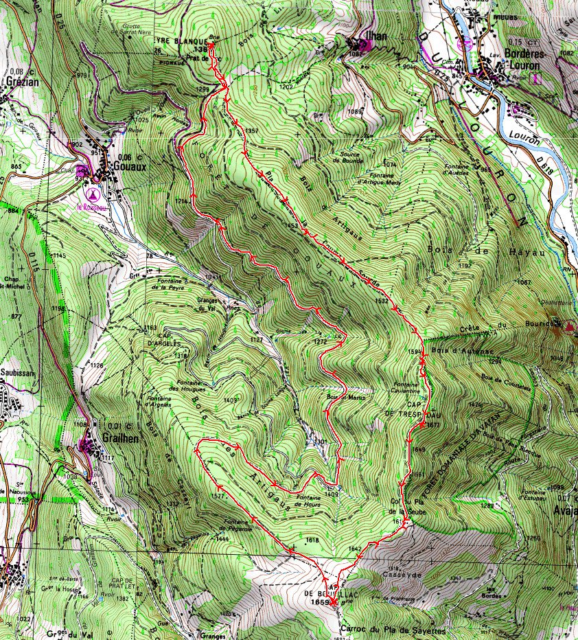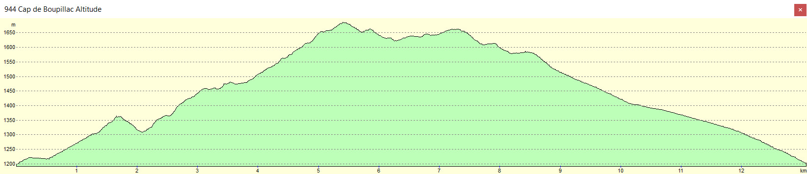 Route forestière Gouaux 1200 m - Col 1300 m - Peyre Blanque 1360 m - Col 1300 m - Cap de Trespadau 1677 m - Col du Pla de la Seube 1617 m - Cap de Boupillac 1659 m -