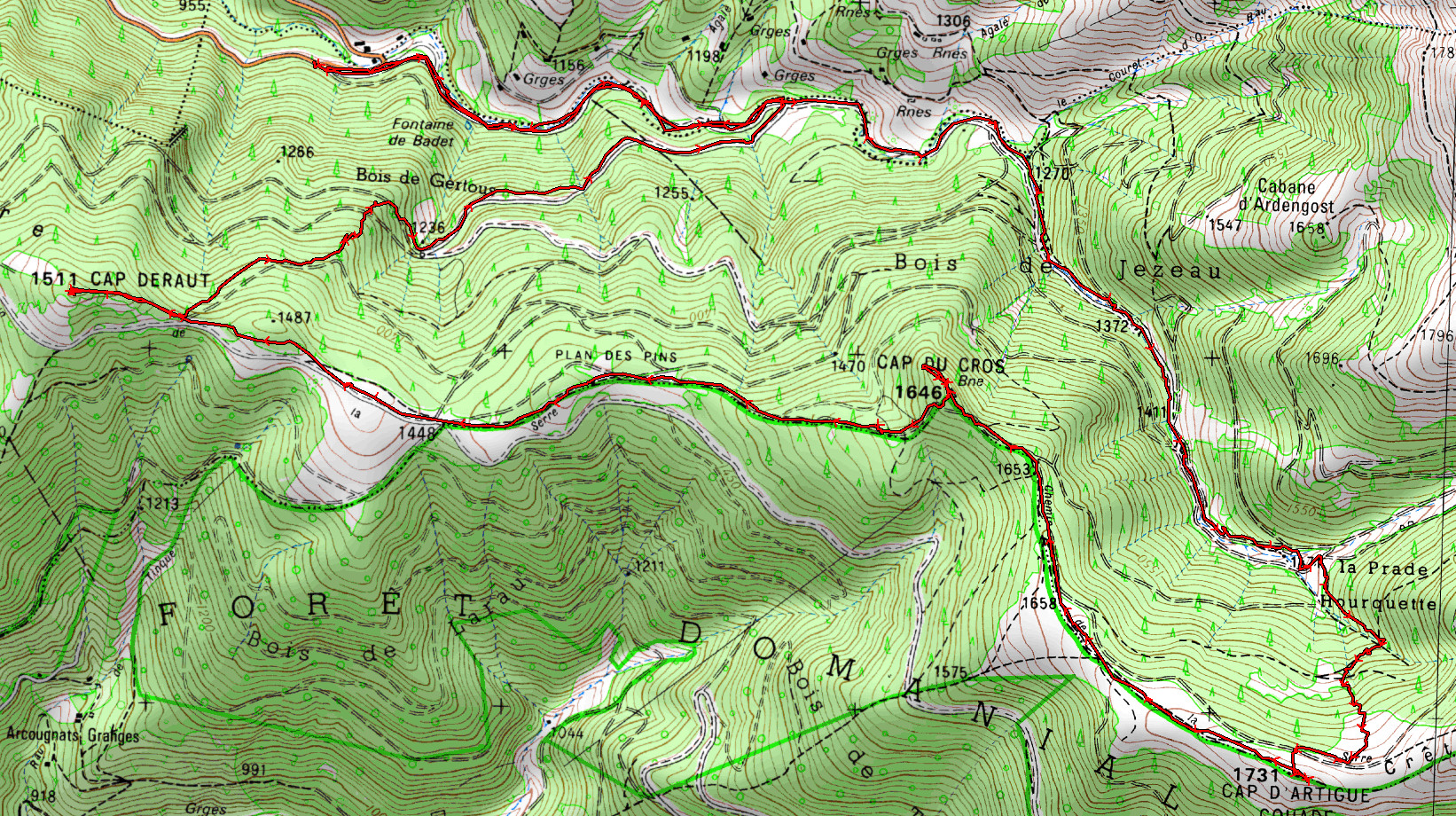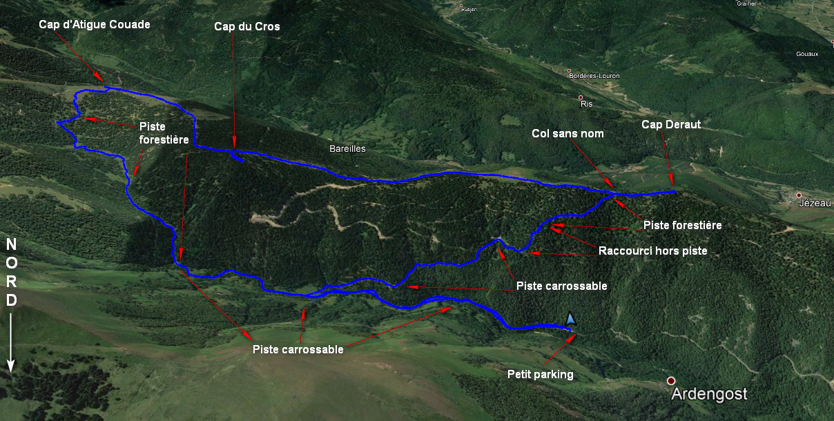 Parking avant Ardengost 1030 m - La Prade Hourquette 1500 m - Cap d'Artigue Couade 1731 m - Cap du Cros 1646 m - Col 1448 m - Cap Deraut 1511 m - Parking avant Ardengost 1030 m