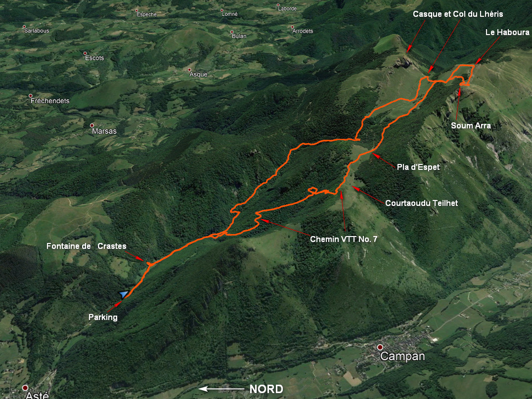 Parking Fontaine des Crastes 660 m - Col du Lhéris 1383 m - Le Haboura 1628 m - Col 1553 m - Soum Arra 1621 m - L'Entrade 1563 m - Pla d'Espet 1287 m -