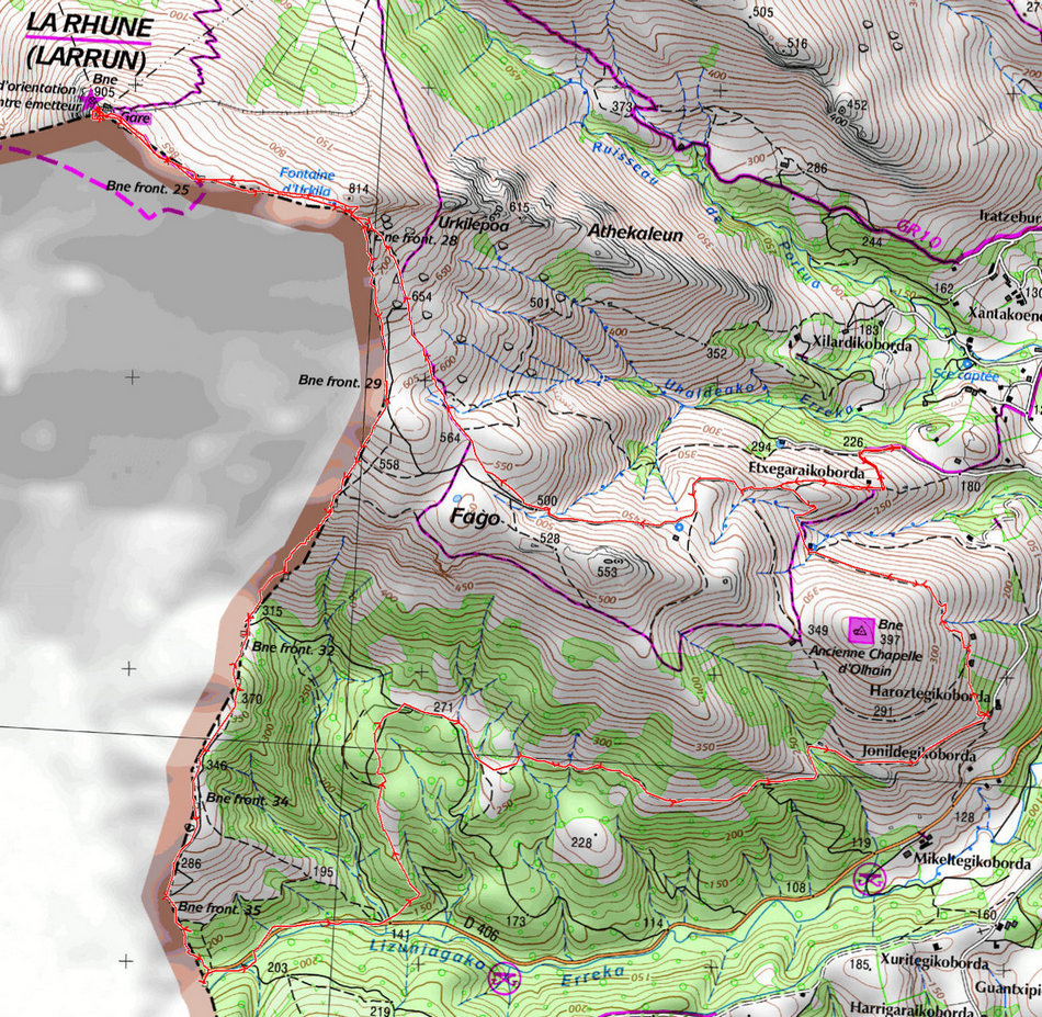 Pour suivre la frontière jusqu'à la borne 36, suivre le même itinéraire jusqu'au ressaut qui suit la Fontaine d'Urkila. On trouve les bornes 25, 26 et 27 et quelques bornes intermédiaires entre La Rhune et la Fontaine d'Urkila. Dans la descente de la partie raide on trouve la borne 28 sur la droite. Ensuite on quitte le chemin de montée pour descendre au sud jusqu'à la borne 29 et sud-est jusqu'à la borne 36. Trouver les bornes jusqu'à la No. 35 n'est pas très difficile, mais pas toujours très agréable pour cause de végétation récalcitrante. Entre la 35 et la 36 une zone boisée à traverser demande de rechercher son chemin. On finit à la borne 36 en bordure de la route qui passe en Espagne. Cette borne est sur emplacement qui comporte aussi une solide table en pierre et une stèle. Il y a aussi un panneau explicatif.