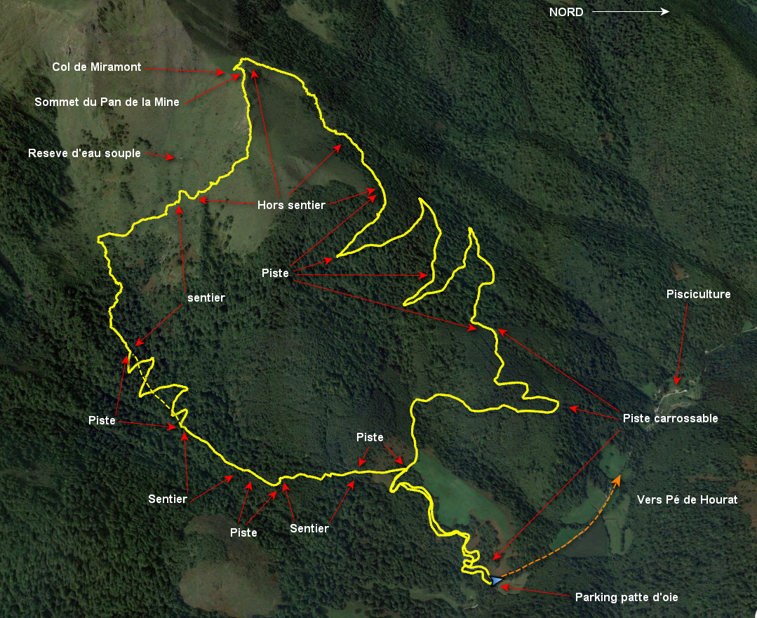 Parking 510 m - Bifurcation 608 m - Arête est 1300 m - Sommet du Pan de la Mine 1375 m - Col de Miramont 1368 m - Piste 1000 m - Piste carrossable 690 m - Parking 510 m