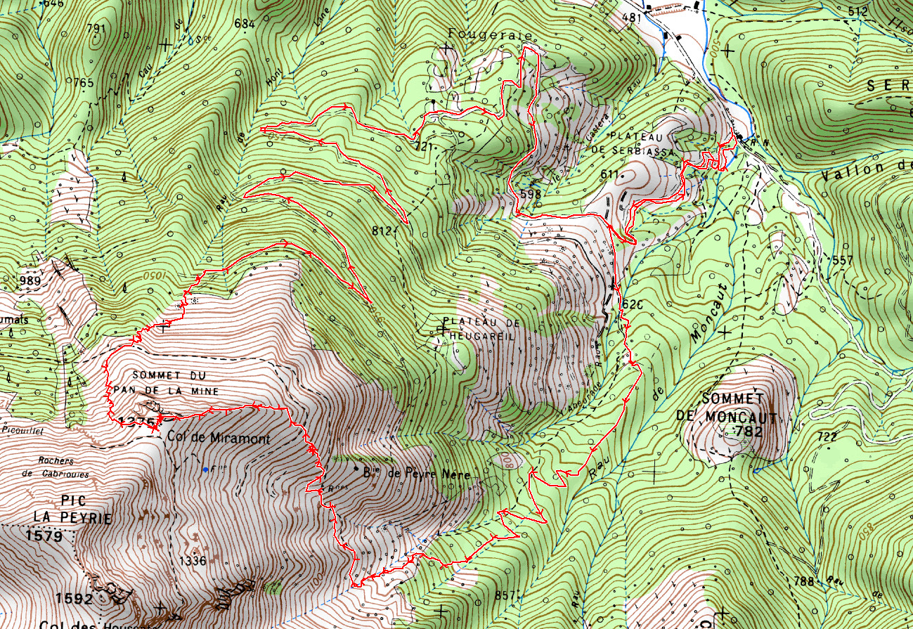 A la sortie de la forêt, à 1020 m d’altitude prendre un sentier, principalement emprunté par les vaches, en direction de la bergerie de Peyre Nère jusqu’à une ruine peu avant la bergerie. A partir de là on a quitté le sentier pour monter au mieux du terrain et de la végétation en direction l’arête est. Le cheminement de la trace amène sur l’arête à 1300 m, elle est sans difficulté jusqu’au sommet.