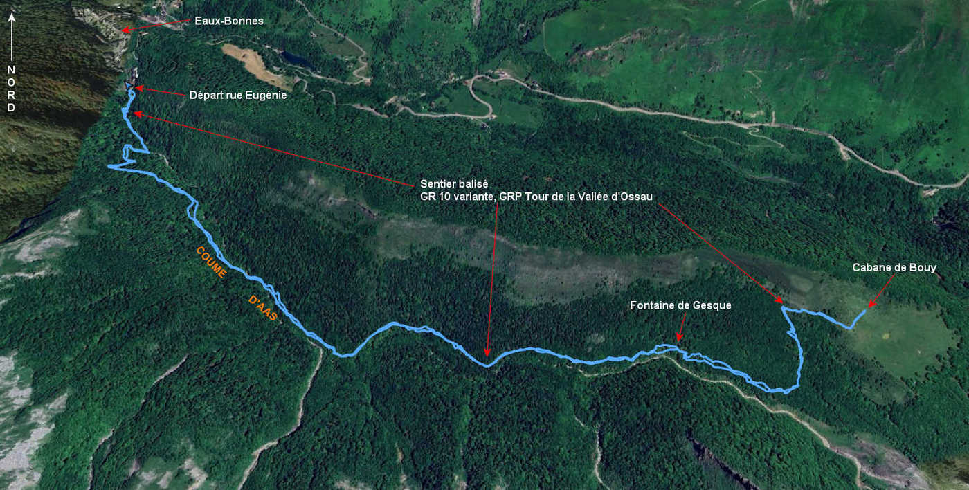 Du parking, laisser sur la gauche la « PROMENADE DE L’IMPERATRICE » pour prendre la piste dans le milieu du virage, vers la cabane et le plateau de Bouy. C’est un tronçon du « GRP TOUR DE LA VALLEE D’OSSAU » et ce sentier sert aussi de variante au GR 10, il n’y a donc pas de difficulté d’orientation. Le parcours se fait en sous-bois jusqu’au Plateau de Bouy.