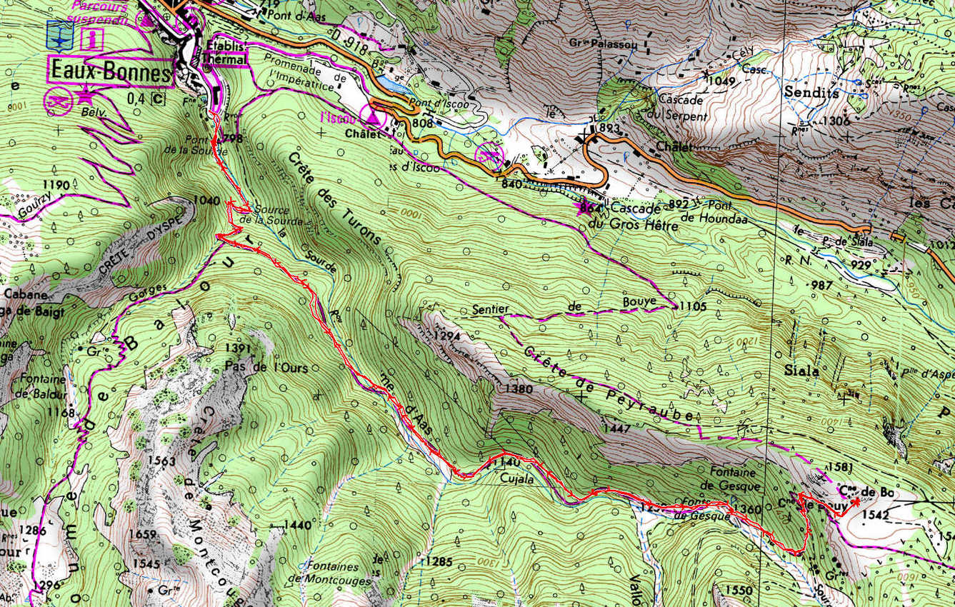 Rue Eugénie 790 m - Pont de la Sourde 798 m - Fontaine de Gesque 1360 m - Cabane de Bouy 1560 m - Rue Eugénie 790 m