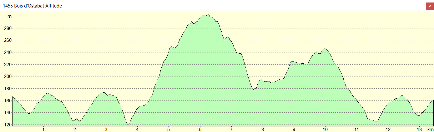 Au point Haranbeltzeko Bizkarra – 219 m, tourner à droite. Puis, au point Barneix – 219 m, suivre la piste sur la gauche : elle ramène à la cabane des chasseurs. Continuer ensuite par la route vers la droite pour revenir à Ostabat.