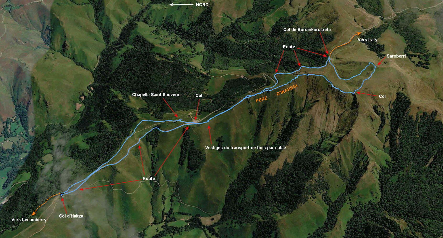 Du Col d’Haltza, suivre la direction de la chapelle Saint-Sauveur en empruntant le sentier situé sur la gauche de la route en montant. Après une courte ascension, au point 832 m, le sentier rejoint le col d’Harizkurutxe. Rester à gauche de la route pour continuer à suivre la crête jusqu’au point 932 m. De là, descendre vers la chapelle Saint-Sauveur, puis suivre le bout de piste qui ramène à la route. La traverser et rejoindre les vestiges de l’ancien transport de bois par câble.