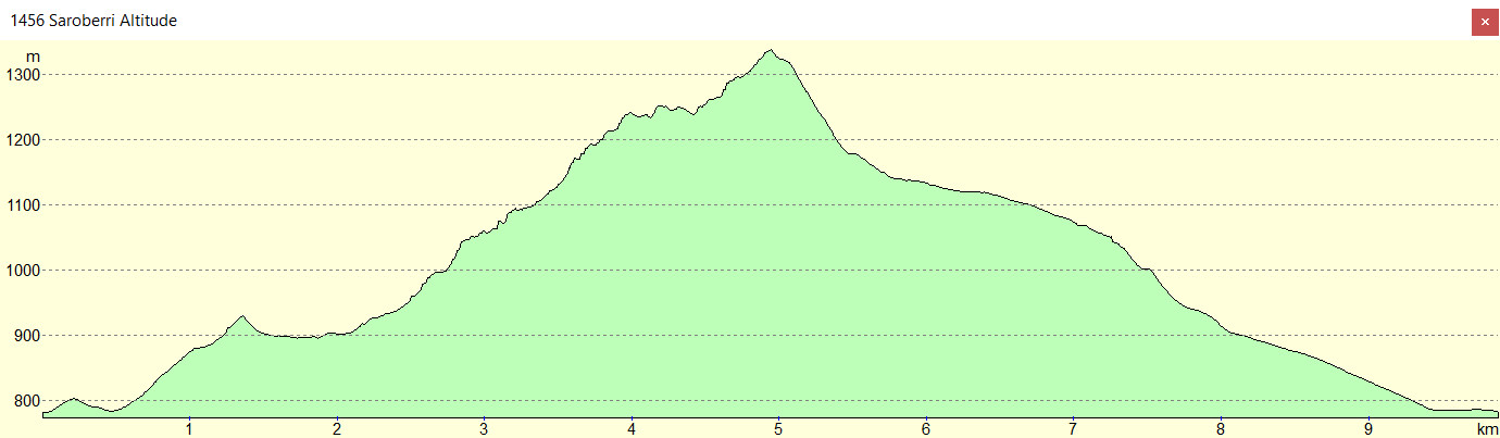 Poursuivre sur la crête : après un premier ressaut facile, le second se termine de manière plus raide. À partir de ce point, la première partie de la crête se présente comme une succession de mamelons plus ou moins redressés mais peu difficiles. On peut la suivre intégralement ou rester sur le sentier qui la longe sur la gauche. La seconde partie est plus facile et agréable à parcourir jusqu’au point 1252 m, où il faut obliquer au sud-est pour terminer l’ascension vers le sommet de Saroberri.