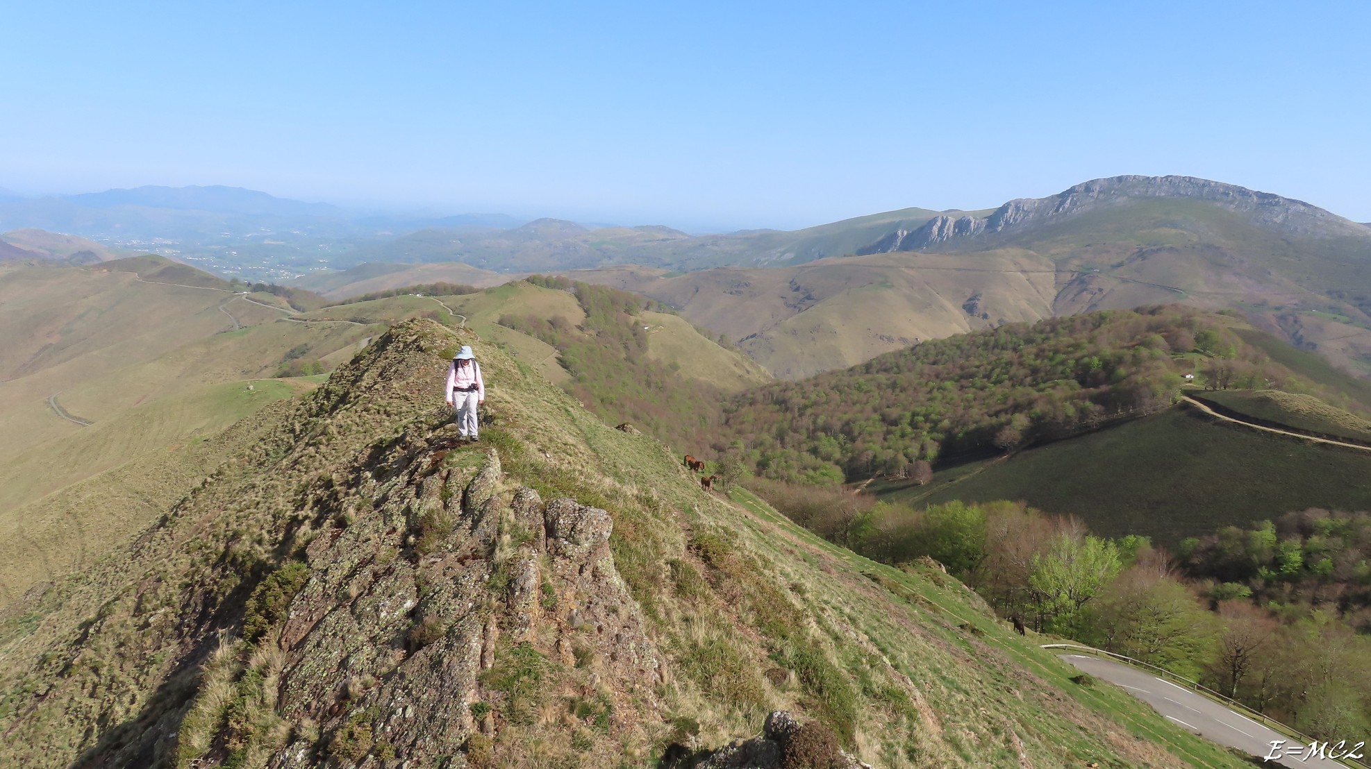 Du sommet, descendre au nord-est puis obliquer à gauche pour rejoindre la piste au niveau d’un abreuvoir. La suivre vers la droite jusqu’au Col de Burdinkurutxeta. Prendre ensuite la route vers la gauche jusqu’au premier lacet. Descendre vers l’abreuvoir et poursuivre sur le sentier afin d’éviter de repasser par la crête. On retrouve l’itinéraire de montée au niveau du premier ressaut raide. Depuis les vestiges de l’ancien transport de bois par câble, rejoindre la route et revenir au point de départ par celle-ci.
