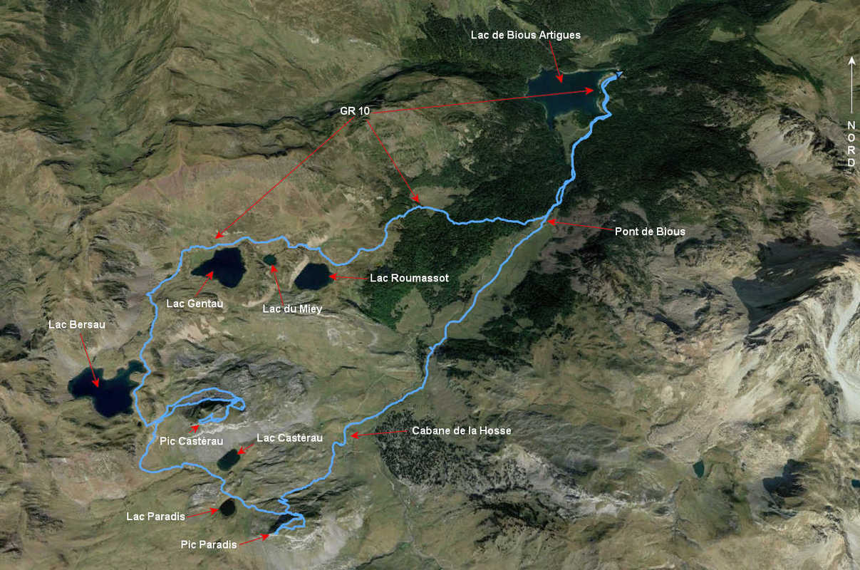 Descendre du Pic Paradis par le même chemin pour reprendre le sentier aux environs du Lac Castérau ou descendre directement sur les cabanes de la Hosse, trace gpx. Suivre le chemin de Saint-Jacques puis le GR 10 emprunté à la montée à partir du pont de Bious.