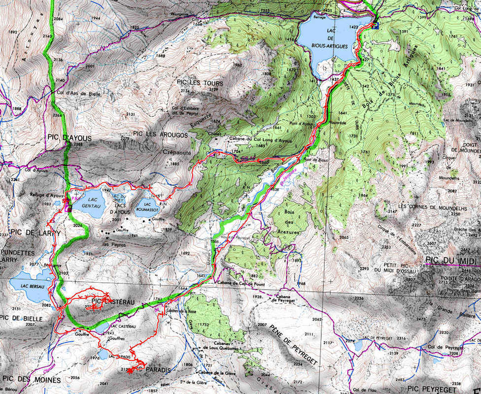 Lac de Bious Artigues 1422 m - Pont de Bious 1535 m - Lac Roumassot 1845 m - Refuge d'Ayois 1870 m - Lac Berau 2080 m - Pic Casterau 2227 m - Lac Paradis 1976 m - Pic Paradis 2129 m -