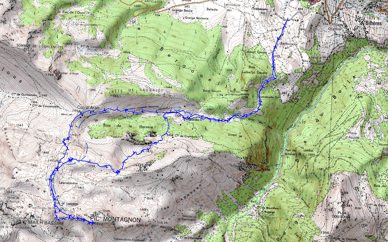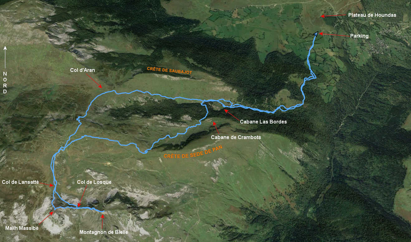 Plateau de Houndas 870 m - Cabane les Bordes 1290 m - Col d'Aran 1654 m - Col de Lansatté 1860 m - Mailh Massibé 1973 m - Col de Losque 1900 m - Montagnon de Bielle 1973 m -