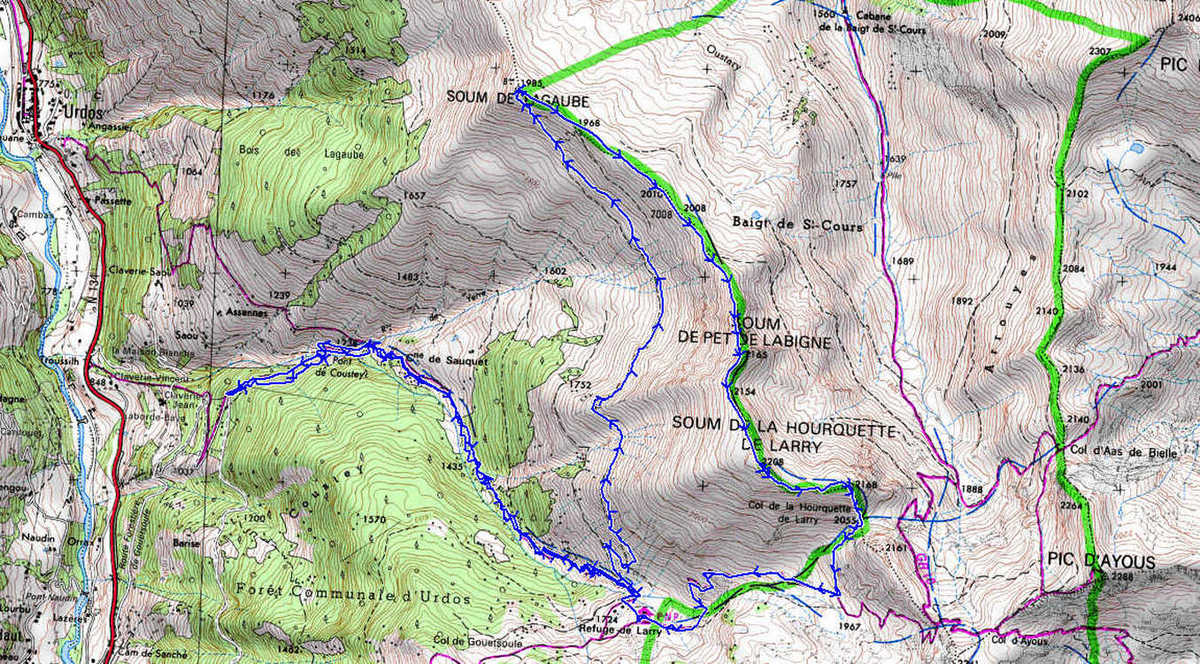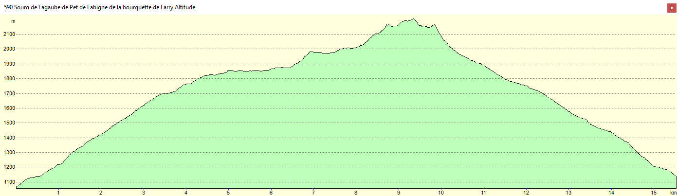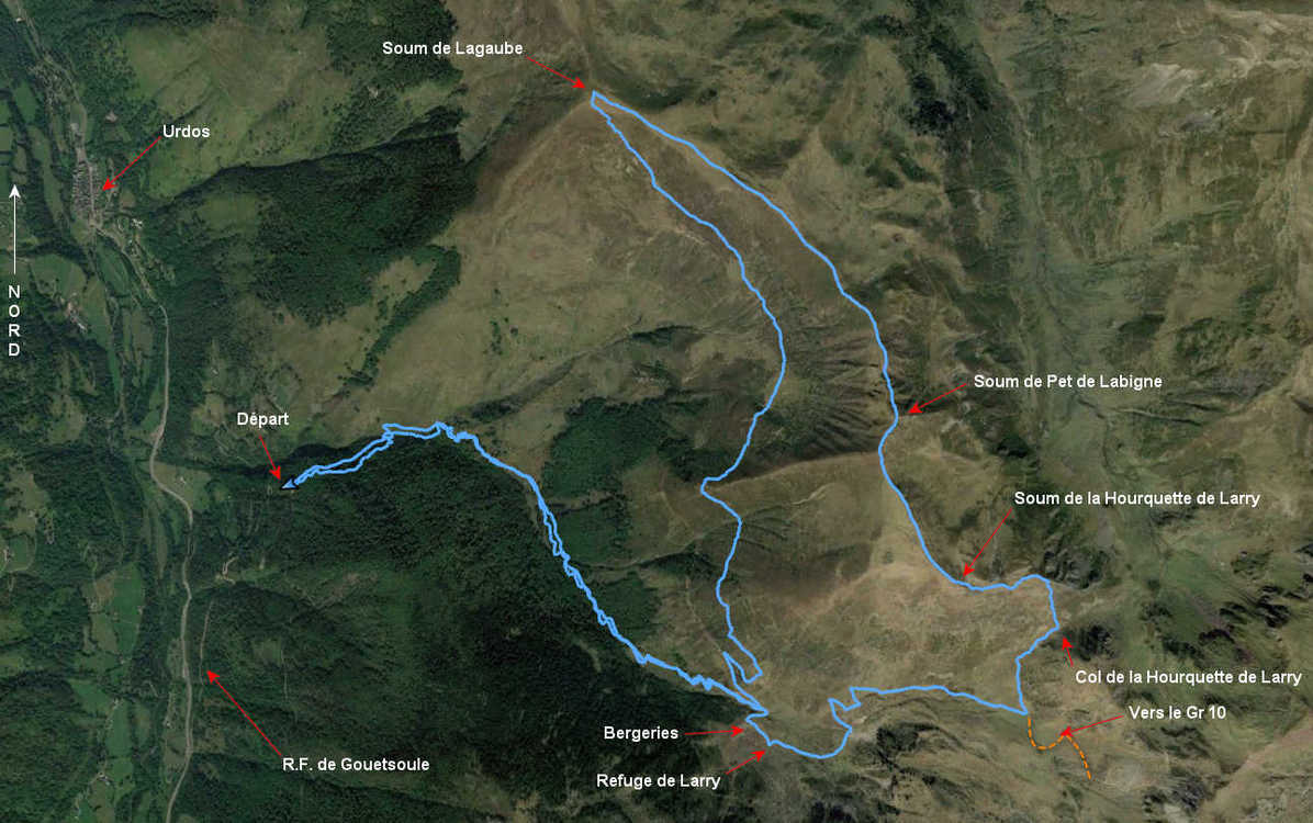 R. F. de Gouetsoule 1140 m - Cabane de Larry 1720 m - Soum de la Gaube 1985 m - Soum de Pet de Labigne 2165 m - Soum de la Hourquette de Larry 2208 m -