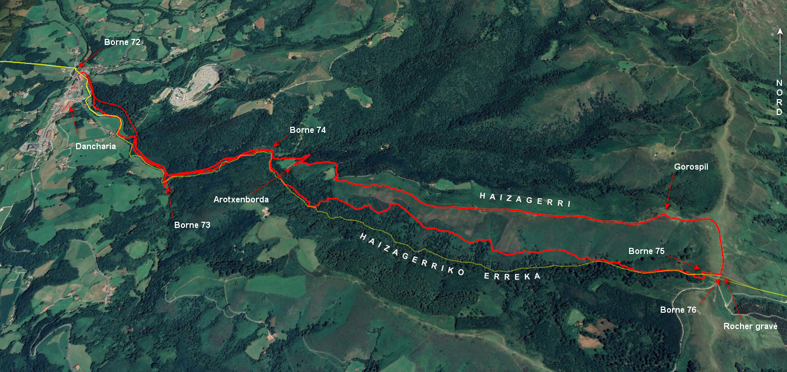 Borne 72 Dancharia 69 m - Borne frontière 73 88 m - Borne frontière 74 100 m - Col de Gorospil 662 m - Sommet 691 m - Col 632 m - Gorospil 658 m - Arotxenborda 190 m - Dancharia 69 m