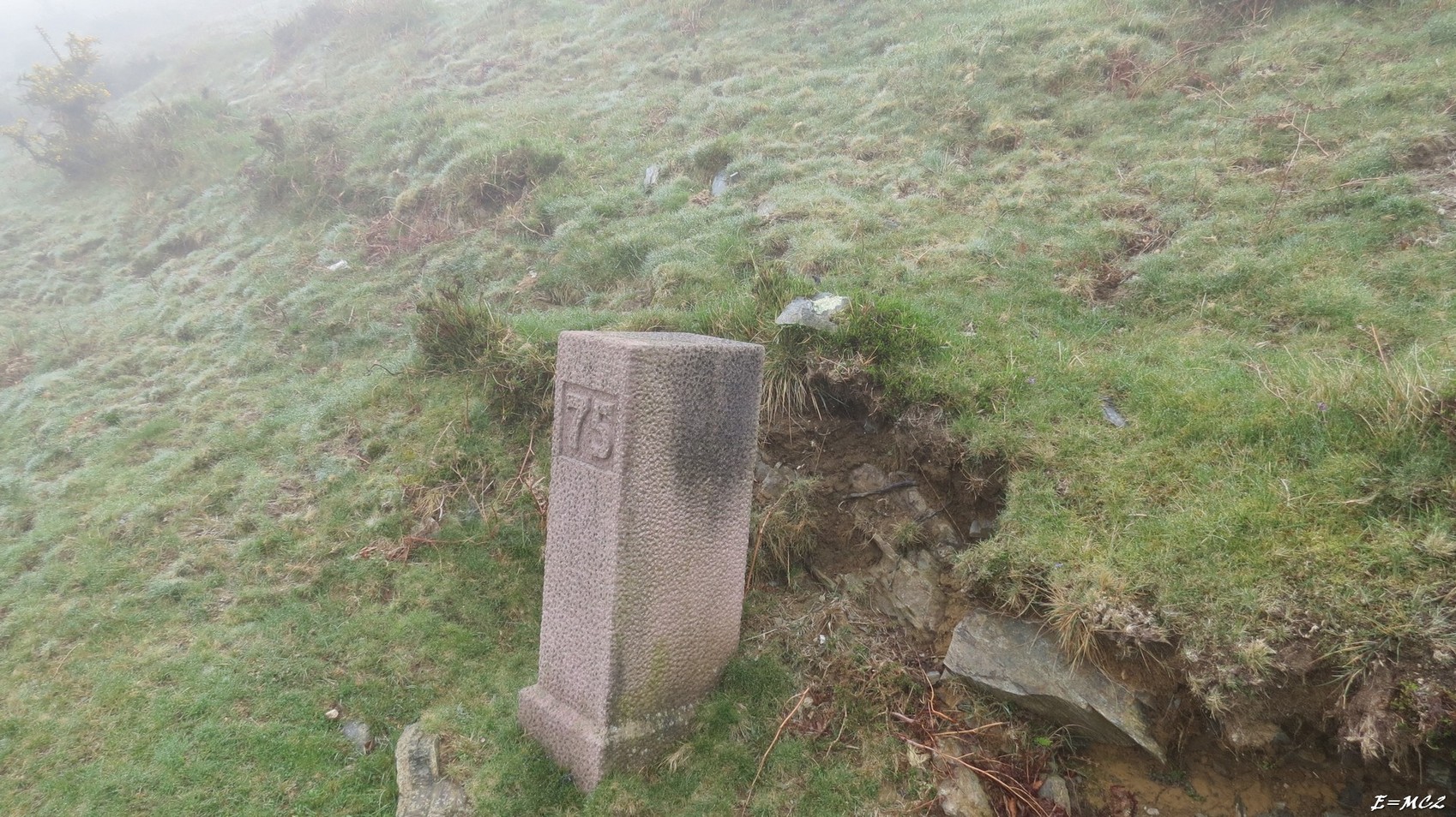 Continuer en longeant le ruisseau, pour la borne 74 (proche d’une pisciculture) il y a très peu de décalage et on la trouve après avoir traversé le cours d’eau sur une passerelle. A partir de la borne pour rester sur la frontière il faut suivre le torrent. J’ai pu le faire sur une bonne distance, mais est arrivé le moment où la végétation est devenue de plus en plus pénible. Etant seul et ne voulant pas prendre de risque, je suis monté sur le flanc gauche du vallon, 100 m environ et j’ai suivi au mieux une courbe de niveau et j’ai repris la frontière dès que j’ai pu vers 400 m d’altitude pour la suivre jusqu’au col de Gorospil sans trop de difficulté. J’ai eu un peu mal à trouver les bornes 75 et pour cause de brouillard. La borne 76 se trouve facilement au Col de Gorospil. A côté de la borne il y a un gros rocher plat gravé.