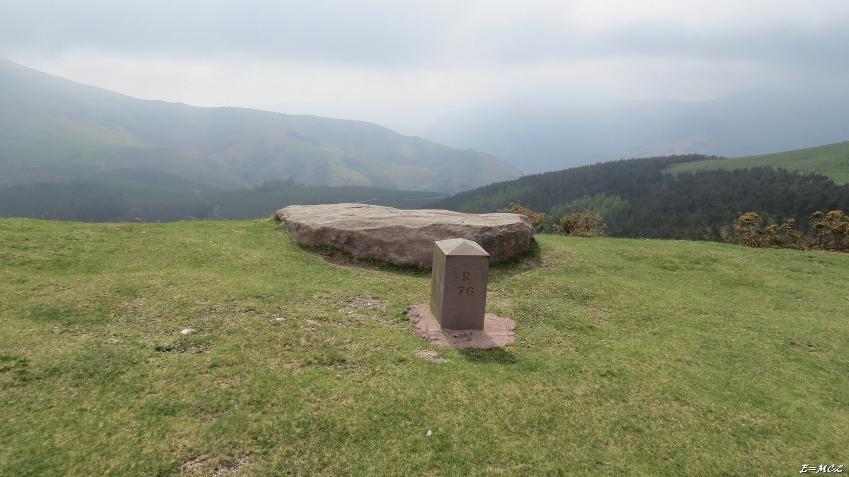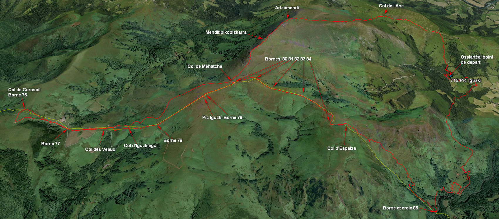 Peu de distance après la barrière sur la droite il y a une amorce de sentier qui remonte à travers le bois vers une piste qui va jusqu’au col de l’Ane. Une fois au col virer au sud-ouest et remonter pleine pente par des sentes plus ou moins bien marquées vers le Pic Artzamendi sur lequel trône au sommet un radar de l’aviation civile. Continuer sur la crête jusqu’au col de Méhatché. Poursuivre par le GR 10 pour contourner par le nord le Pic Iguzki. Quitter le GR 10 à hauteur d’un gite d’étape pour atteindre le Col de Gorospil par la piste. Au col il y a la borne 76 et un monolithe tabulaire où sont gravés des symboles. Du col pour suivre la frontière tirer tout droit vers l’est, en repassant à proximité du gite d’étape, continuer toujours sur la frontière. On trouve facilement les borne 77 aux environs du Col des Veaux et la borne 78 un petit peu après le Col d’Iguzkiégui. Monter directement la pente qui permet d’atteindre le Pic Iguzki. La frontière passe légèrement à gauche du sommet, la borne 79 est à la fin de la montée. Du pic on peut descendre directement, toujours en suivant la frontière, au Col de Méhatché (borne 80). Après le col on trouve la borne 81 au milieu d’un cromlech. A peu de distance de la borne 81, on trouve en bordure d’une dépression un gros rocher sur lequel sont gravées deux croix. Le reste du parcours jusqu’au Col d’Espalza se fait sur du terrain facile. La borne 83 commence à être très abimée.