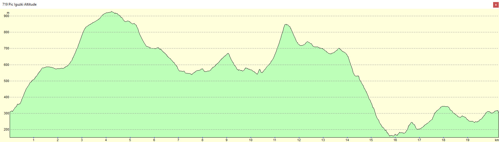 Ossiartea 309 m - Col de l'Ane 584 m - Artzamendi 926 m - Menditipikobizkarra 872 - Col de Méhatché 725 m - Col d'Iguzkiégui 549 m - Col de Veaux 567 m -