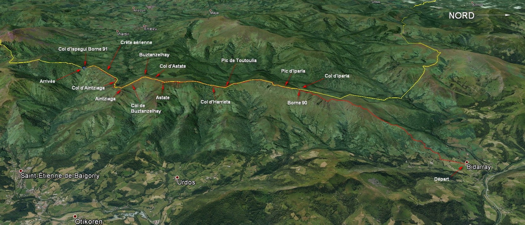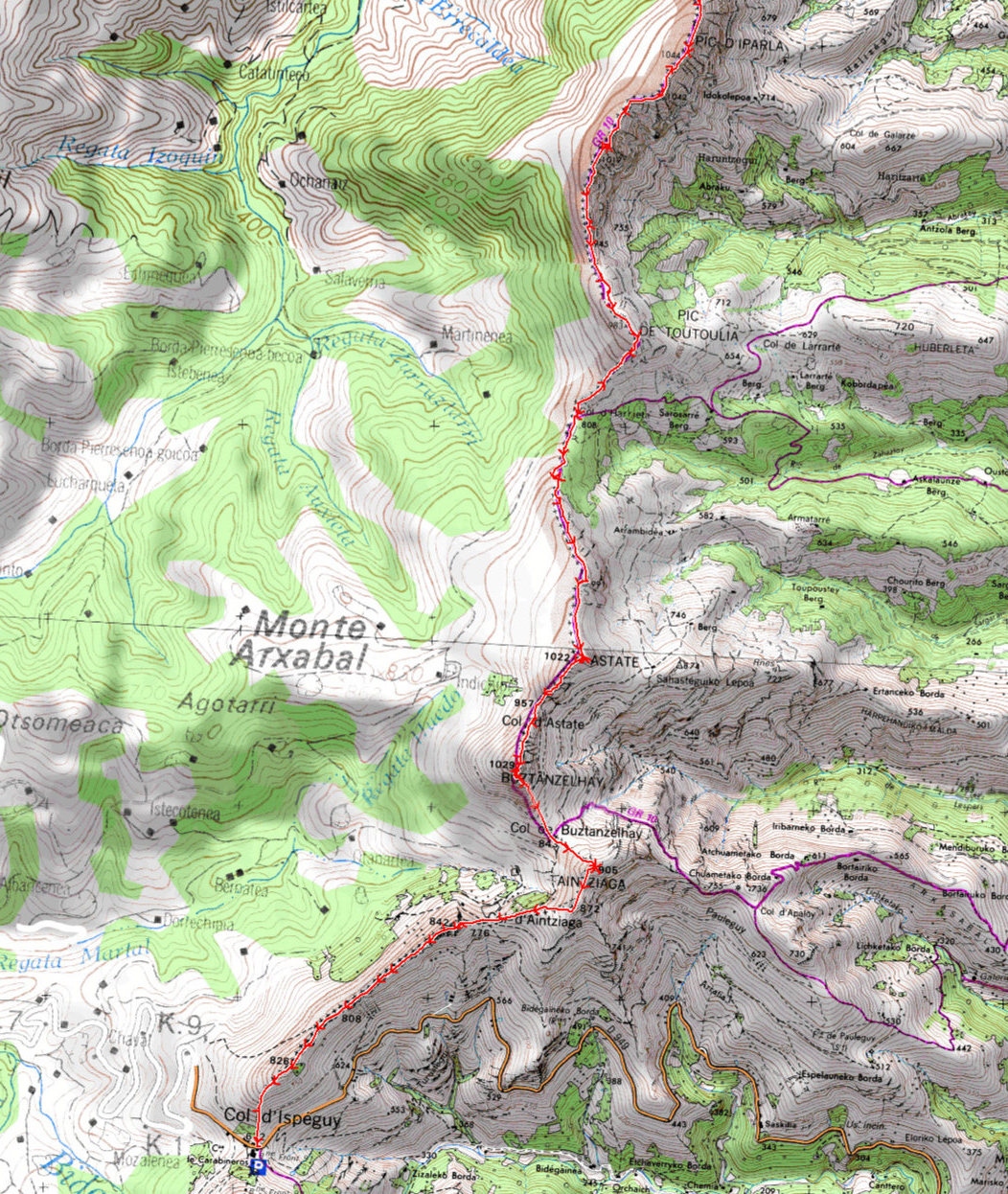 L’itinéraire consiste à suivre le GR 10 de Bidarray jusqu’au col de Buztanzelhay où le GR descend à l’est vers Saint Etienne de Baïgorry. Donc du Col de Buztanzelhay, pour rejoindre le col d’Ispéguy par la ligne frontière, garder la direction sud-est pour atteindre le sommet d’Aintziaga, ensuite passer par le point coté 872 m pour arriver au Col d’Aintziaga. Du col rejoindre directement le point coté 842 m, monter ensuite sur la crête. C’est le passage le plus aérien de ce parcours. Arrivé en bout de la crête, on domine le col d’Ispéguy sans problème.