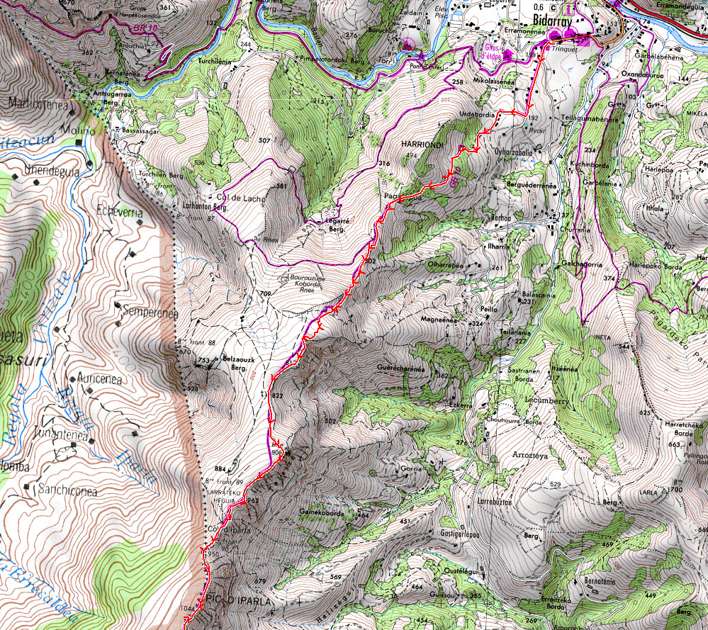 Parking Bidarray 140 m - Larrateko Heguia 962 m - Col d'Iparla 950 m - Pic d'Iparla 1044 m - Col 945 m - Pic de Toutoulia 983 m -