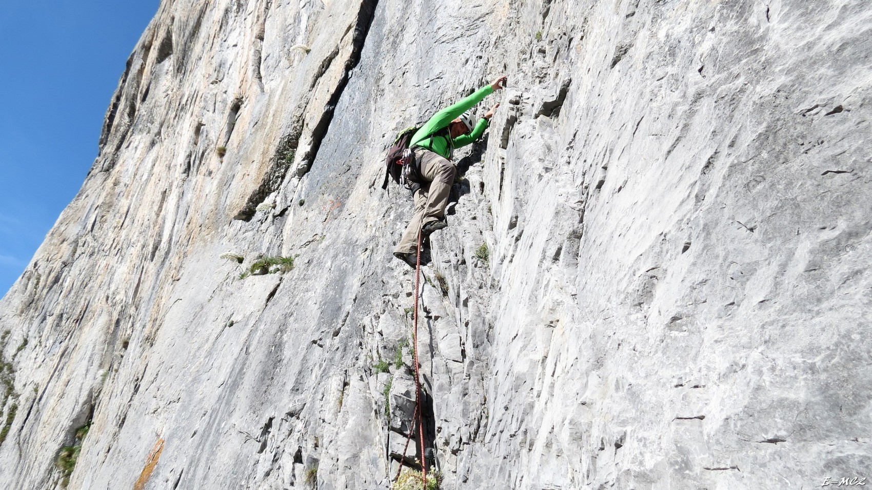 La voie est entièrement équipée. Il y a deux longueurs de corde pour rejoindre le dièdre. La première est en traversée et en dévers. La deuxième est plutôt herbeuse. Une fois celui-ci atteint, la voie est évidente, elle remonte le dièdre incliné sur la droite.