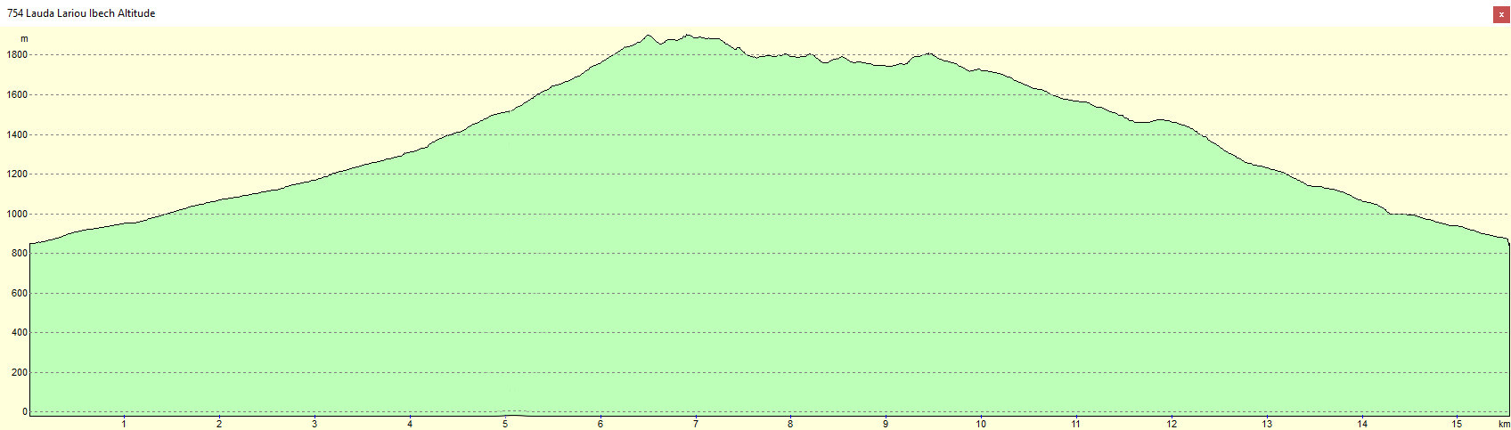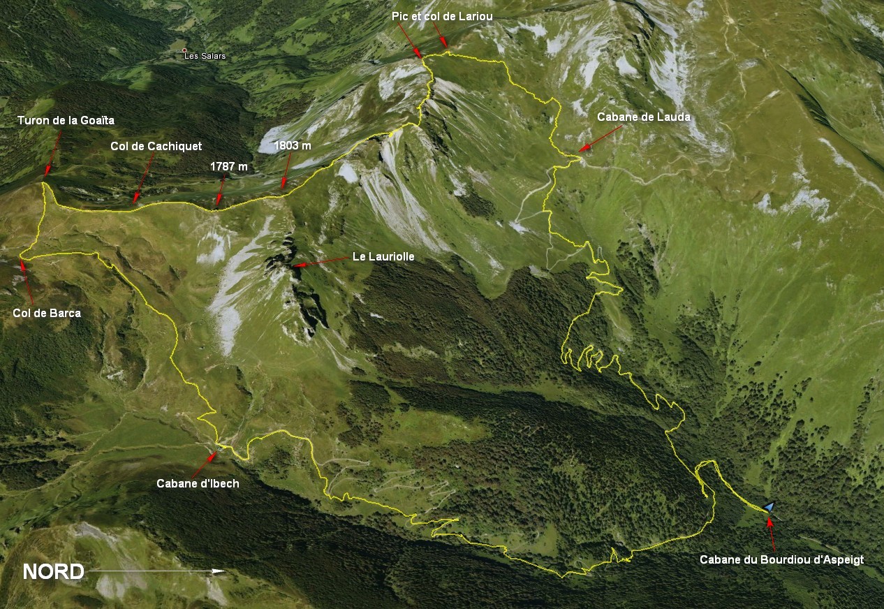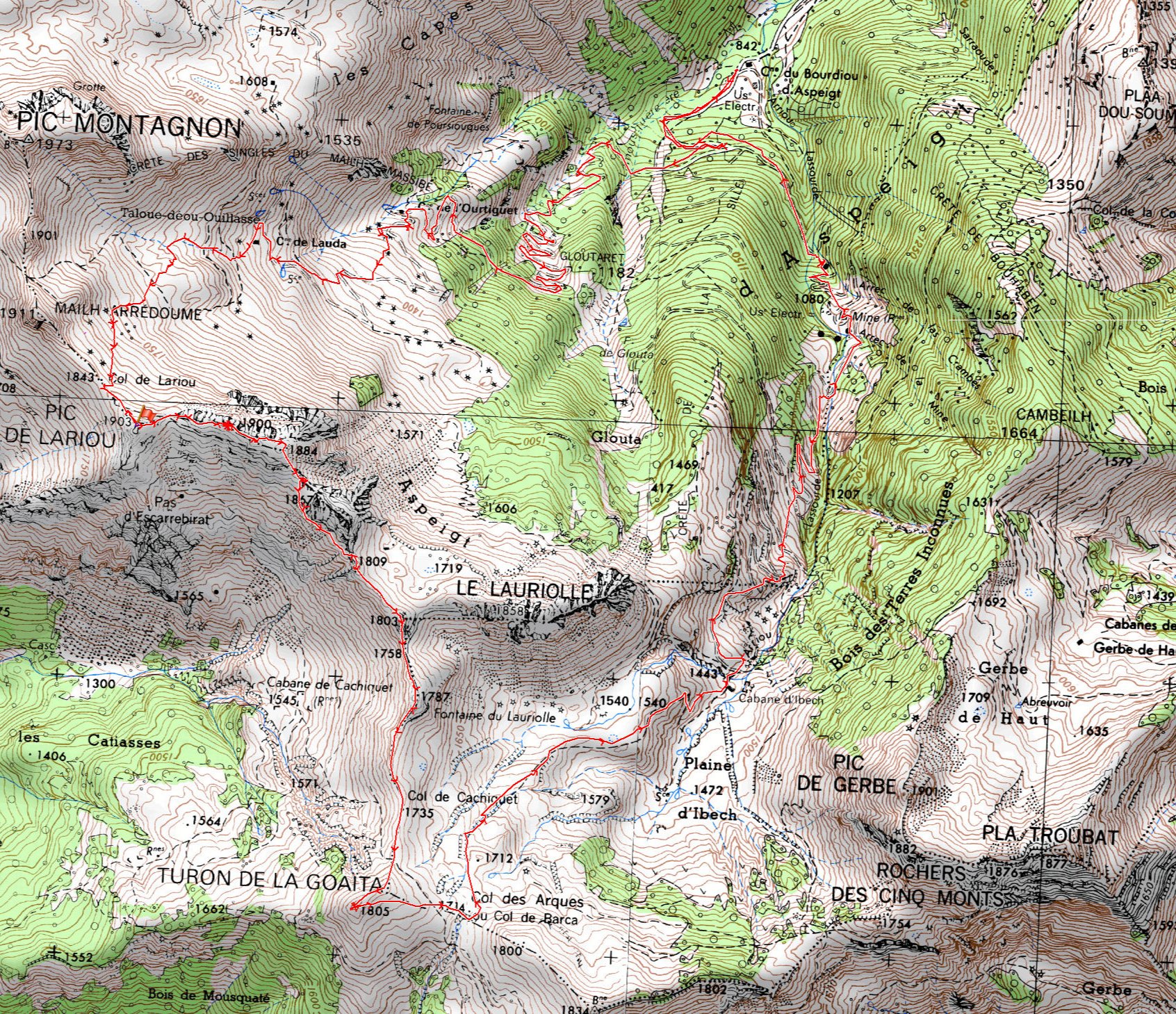 Bourdiou d'Aspeigt 850 m - Cabane de Lauda 1530 m - Col de Lariou 1843 m - Pic de Lariou 1903 m - Col de Cachiquet 1735 m - Turon de la Goaïta 1805 m -