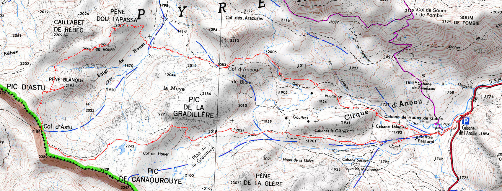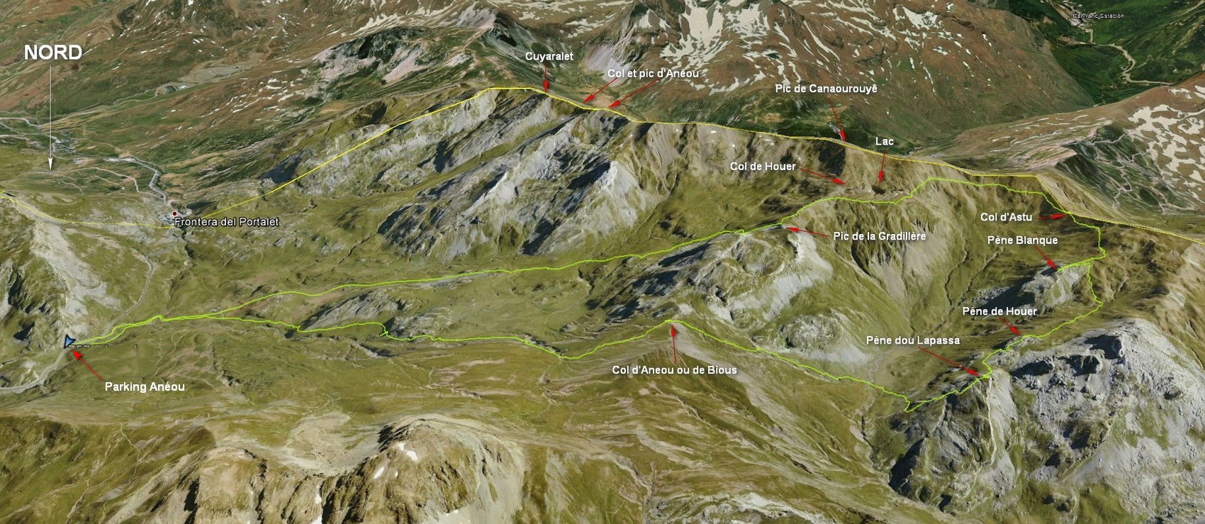 Du Pène Blanque prendre la direction du Col d’Astu sur la frontière*. De ce col partir en traversée en contre bas de la crête frontière pour rejoindre le Col de Houer sur la crête nord du Pic de Canaourouye. Du col suivre la crête vers le Pic de la Gradillère et au pied de celui-ci descendre sur la droite vers le Plaa de la Gradillère et suivre le vallon pour revenir au point de départ.