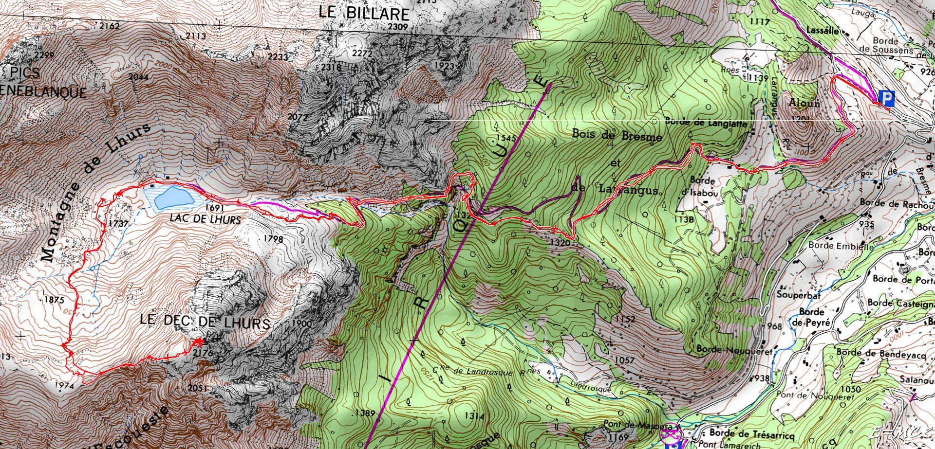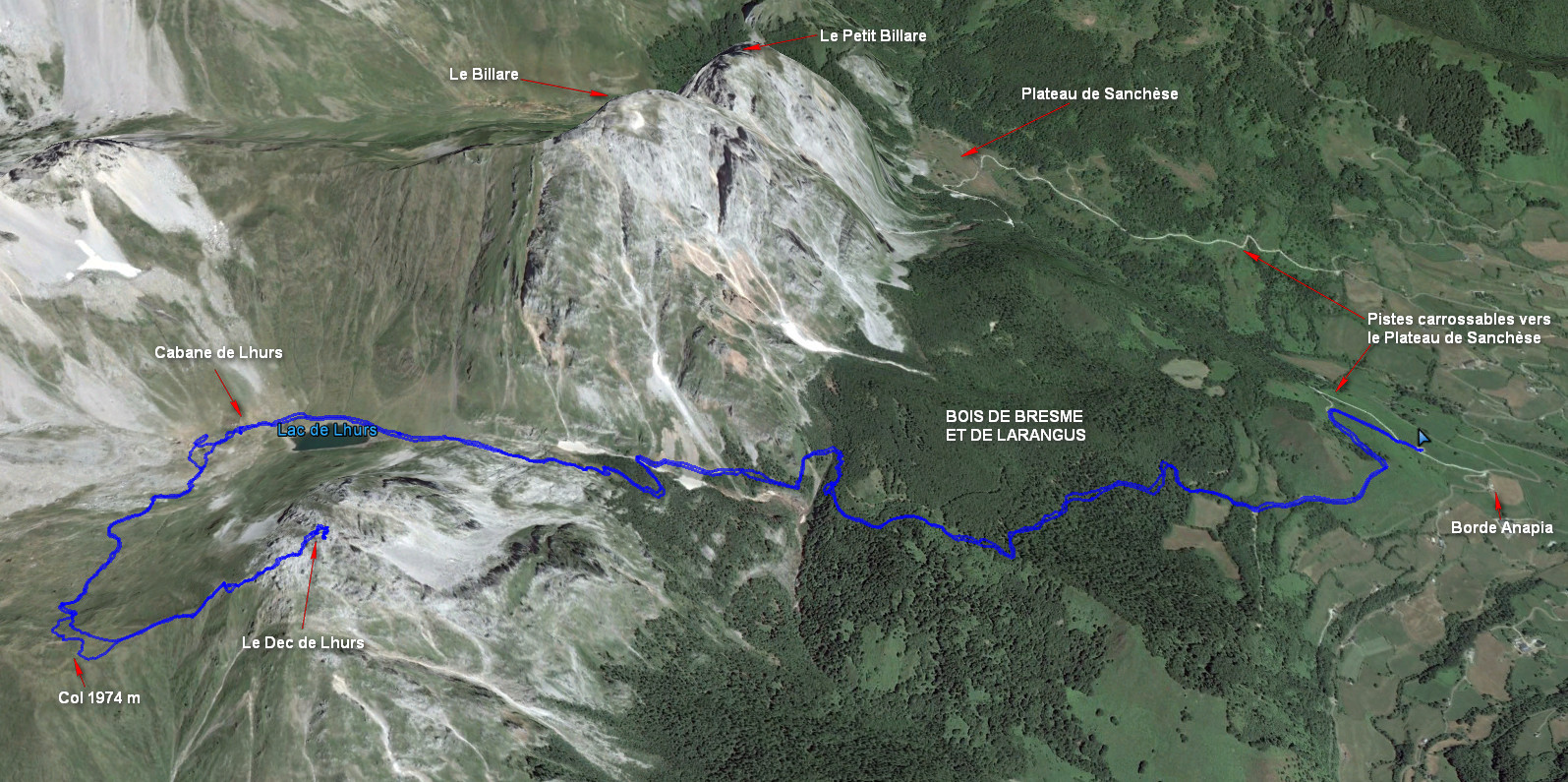 Prendre la direction du Plateau de Sanchèse et très vite on trouve des panneaux indiquant la direction de Lac de Lhurs (2h25). Le chemin jusqu’au lac est sans problème : piste carrossable dans un premier temps et bon chemin ensuite jusqu’au lac, assez fréquenté. Le cheminement contourne le Billare par le sud au pied de celui-ci. Une fois parvenu au lac, le longer par sa rive gauche (nord) et obliquer progressivement vers le sud pour monter par les pentes d’herbe vers le très large col, 1974 m, qui sépare la Table des Trois Rois (à droite) et le Dec de Lhurs (à gauche). Cairns et sentier plus ou moins visibles dans l’herbe. Une fois ce col atteint suivre sur la gauche la crête facile vers le Dec de Lhurs. L’ascension se finit par une partie un peu plus rocheuse et une cheminée facile.