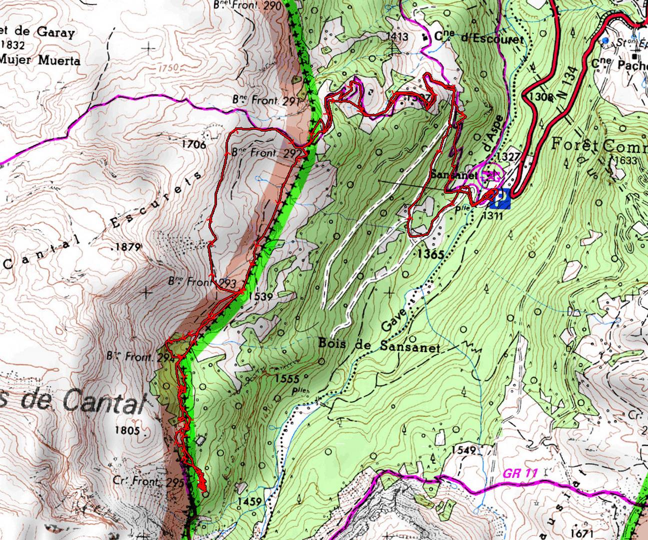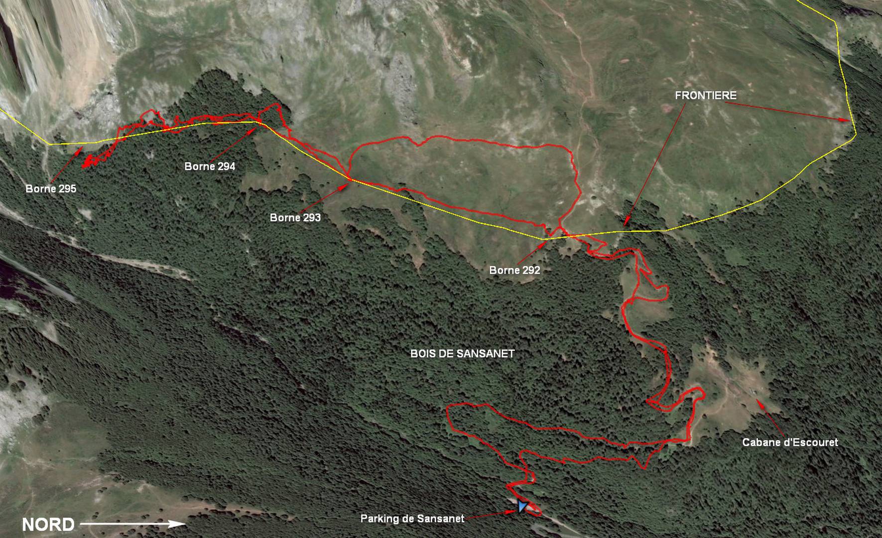 Parking Sansanet 1320 m - Borne 292 1620 m - Borne 293 1539 m - Borne 294 1645 m - Croix 295 1620 m - Parking Sansanet 1320 m
