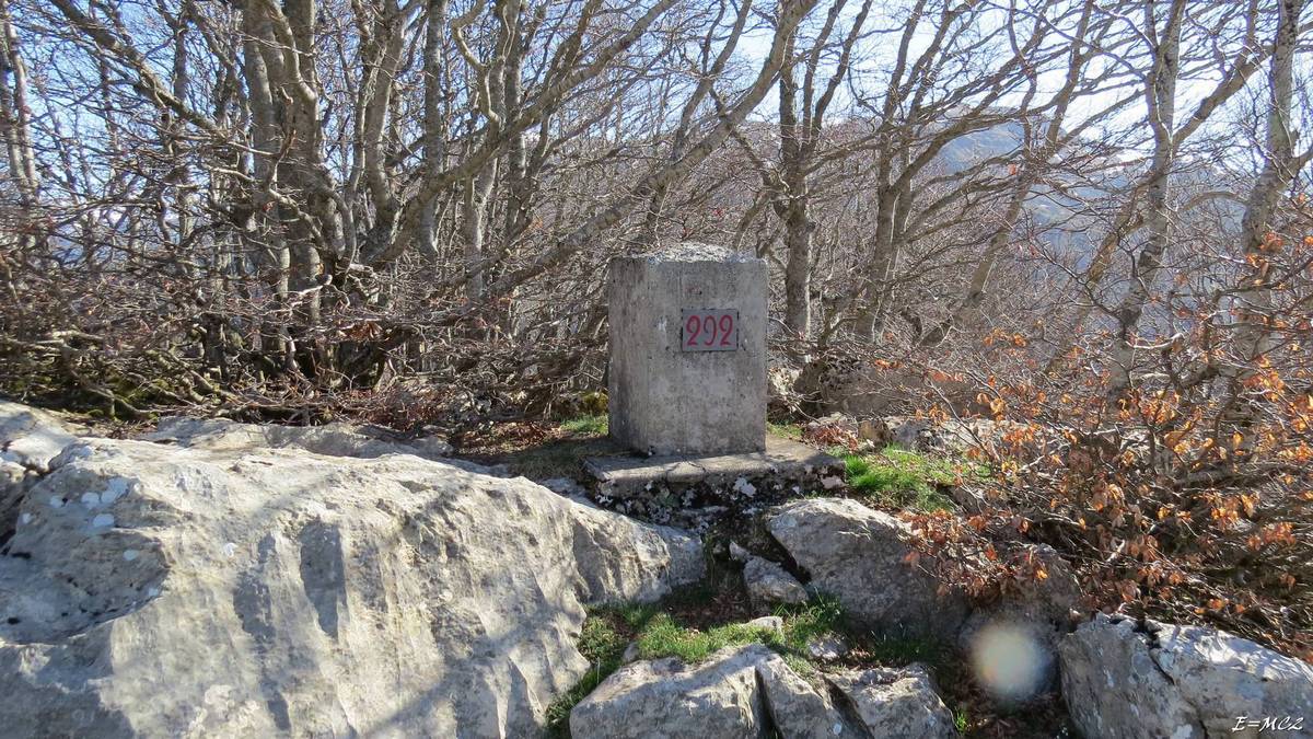 Du parking suivre le chemin du Lac d’Estaens, panneaux jaunes. Au bout d’une heure on arrive sur la frontière, obliquer à gauche et chercher la borne 292 à une cinquantaine de mètres dans les arbres. La borne 293 se trouve à environ 700 mètres vers le sud-ouest au point 1539 m, facile à trouver. Pour la 294, obliquer un peu plus vers le sud-ouest jusqu’à parvenir à un petit ruisseau, le traverser et monter droit au-dessus un peu raide juste avant la borne qui se trouve sur une sorte de mamelon. Ensuite prendre plein sud au mieux, terrain moins facile à travers les rocailles jusqu’à finir contre la muraille : la croix est gravée au pied de celle-ci. Nous l’avions trouvée la fois précédente, cette fois ci il restait trop de neige au pied de la paroi. Retour par le même chemin.