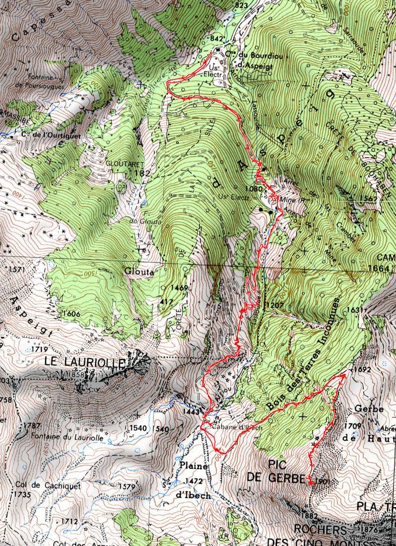 Bourdiou d'Aspeigt 845 m - Bâtiment mines d'Aspeigt 1080 m - Cabane d'Ibech 1450 m - Crête nord 1700 m - Pic de Gerbe 1901 m - Bourdiou d'Aspeigt 845 m