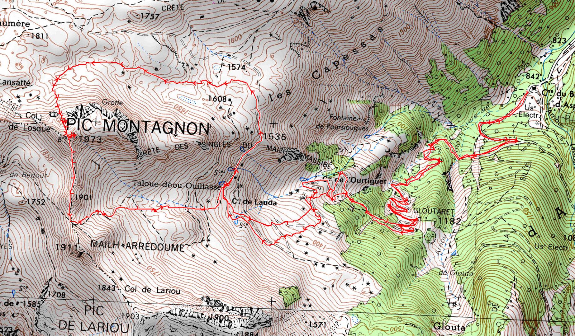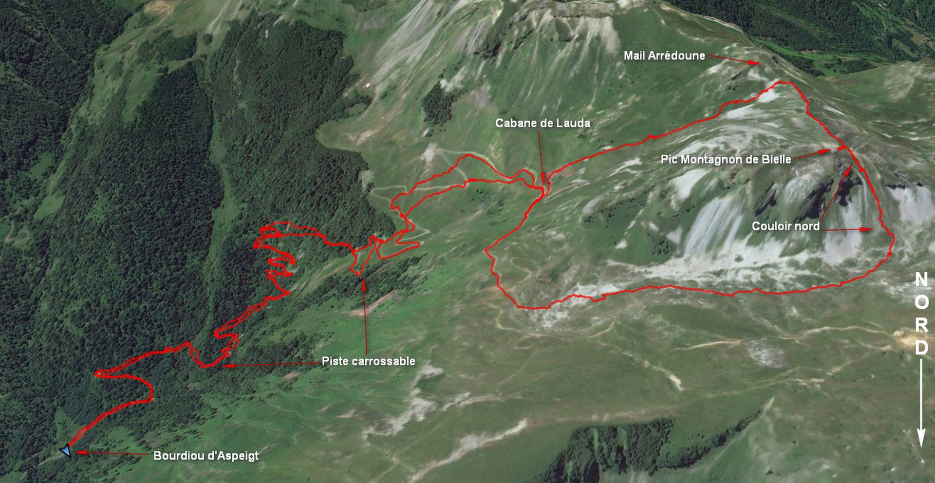 Bourdiou d'Aspeigt 845 m - Cabane de Lauda 1510 m - Pied du couloir nord 1760 m - Pic Montagnon de Bielle 1973 m - Col 1883 m - Sommet 1901 m - Col Arrédoume 1862 m - Cabane de Lauda 1510 m - Bourdiou d'Aspeigt 845 m
