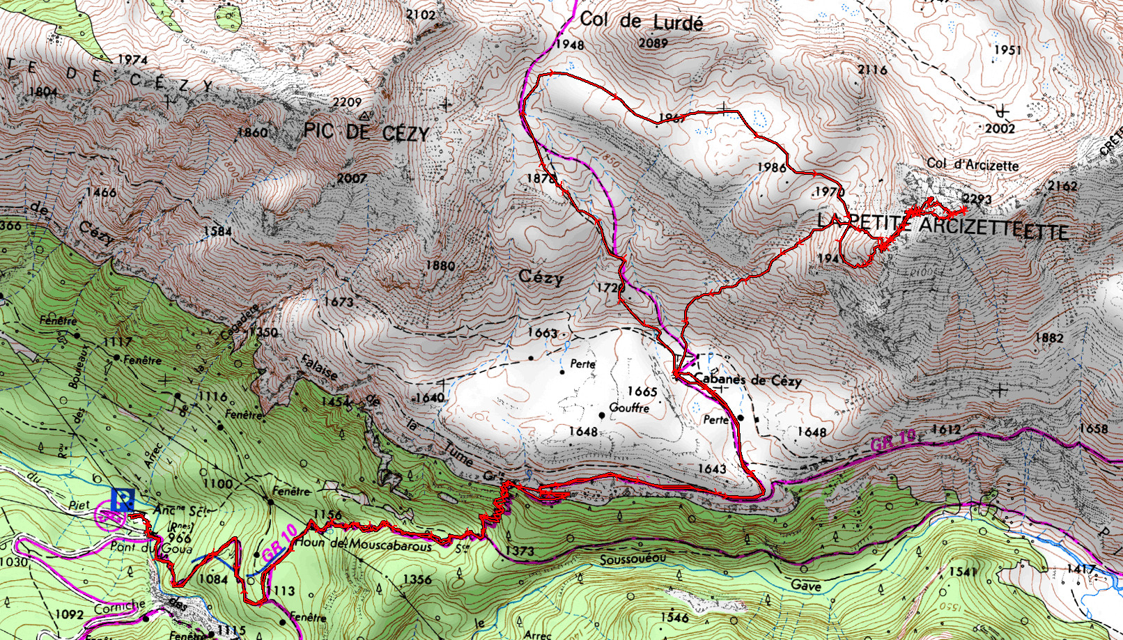 Pont de Goua 950 m - Cabane de Cézy 1640 m - Cuvette 1980 m - Cabane de Cézy 1640 m - Col de Lurdé 1948 m - La Petite Arcizette 2293 m - Pont de Goua 950 m