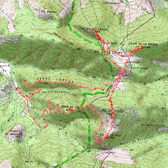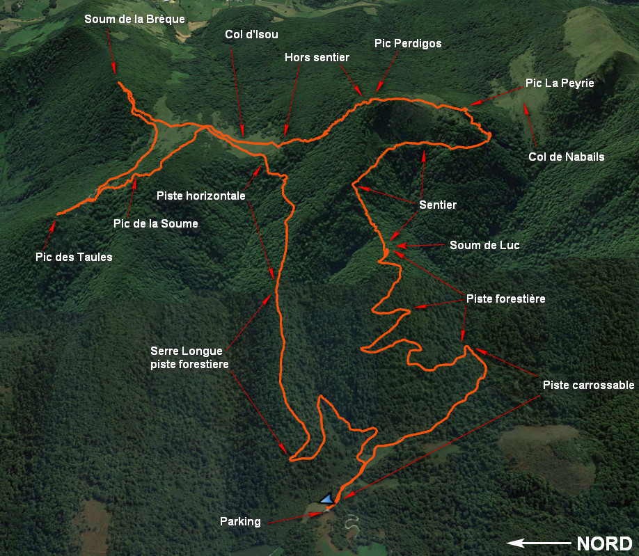 Pour démarrer la randonnée prendre la piste carrossable de gauche et la suivre jusqu’à l’altitude de 620 m, virage serré à droite, pour prendre une autre piste pour engins forestier sur la gauche. Faire 500 mètres environ et prendre sur la droite un bon chemin large et le suivre jusqu’au Sommet de Luc. Du Sommet de Luc revenir en arrière en cherchant sur la droite l’amorce d’un chemin (peu évident), il reste pratiquement horizontal sur 150 mètres jusqu’à croiser un autre chemin laisser ce chemin pour continuer tout droit malgré la croix jaune. Monter par un cheminement peu marqué sur le terrain mais facile à suivre jusqu’à un autre très bon sentier (cairn) et prendre à droite en direction du Col de Nabails. Après avoir fait 1 kilomètre sur ce bon sentier (350 mètres avant le Col de Nabails) on remarque sur la gauche une trouée dans la forêt. Remonter ce couloir herbeux raide mais facile et sur le haut de ce couloir appuyer à droite pour monter au Pic La Peyrie, il faut s’aider un peu des mains et choisir son passage. Je suis redescendu par le même cheminement pour ensuite continuer vers le Pic Perdigos, il m’a semblé qu’il aurait été possible de suivre la crête depuis le Pic La Peyrie. Du Pic Perdigos il y a deux options : soit revenir sur ses pas et en bas du couloir d’herbe prendre le bon sentier à droite jusqu’au Col d’Isou soit descendre hors sentier directement sur le Col d’Isou dans la forêt. Le terrain est bon descendre au meilleur et garder la direction nord, un gps facilite bien sûr le maintien du cap. Du Col d’Isou rejoindre le Col d’Arriulé, et du col se diriger vers le nord est dans le bois en direction du Soum de la Brèque. Pas de sentier, végétation assez dense et peu de vue au sommet. Retour au Col d’Arriulé pour ensuite se diriger en traversée vers la Cau de Lème et prendre la crête sur la droite dans la zone la plus abordable, quelques pas d’escalade (I et II). Une fois sur la crête suivre vers le nord-ouest, cheminement peu emprunté mais visible. Pas de signe distinctif au sommet, on y arrive sans s’en rendre compte. Retour à la Cau de Lème par le même chemin. Depuis la clairière de la Cau de Lème monter plein sud pour atteindre le Pic de la Soume. De ce pic descendre vers le sud-est dans un premier temps puis vers le sud-ouest pour repasser au Col d’Isou. Sur le versant ouest du col prendre la piste carrossable. Après 20 minutes dans un virage serré à gauche, quitter la piste pour continuer tout droit sur un chemin large (Serre Longue), à 610 m d’altitude prendre à gauche une piste qui ramène sur la piste du début de la randonnée à 400 mètres du parking.