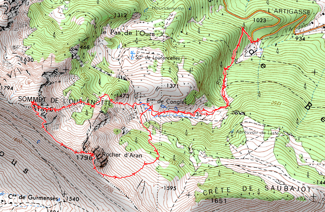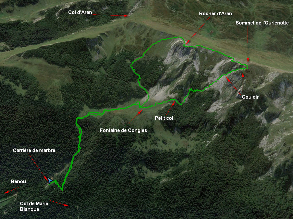 Carrière de marbre 990 m - Fontaine de Congles 1350 m - Petit col 1450 m - Sommet de l'Ourlenotte 1806 m - Rocher d'Aran 1796 m - Carrière de marbre 990 m