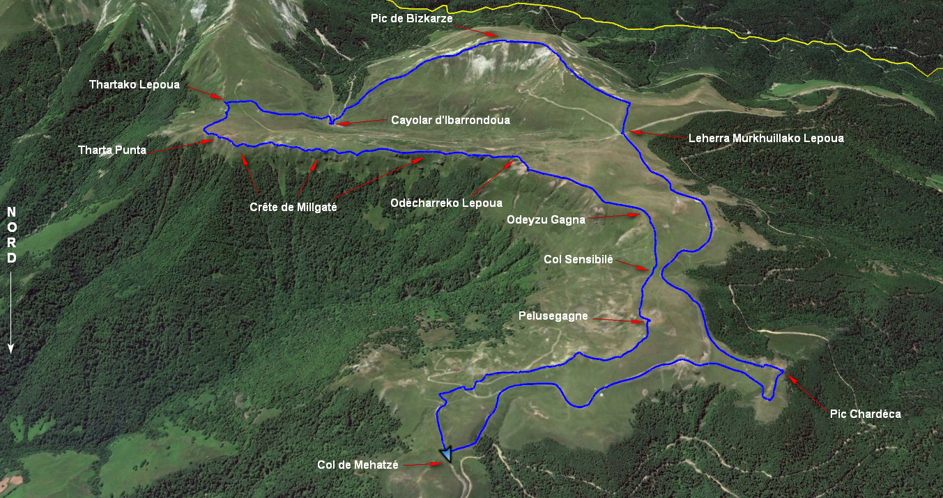 Du Col de Méhatzé poursuivre sur la route goudronnée pendant 1.5 kilomètre, tourner à droite en direction du Pic Chardéca. De ce pic revenir vers la route et la garder sur environ 2 kilomètres jusqu’au Leherra Murkhillako Lepoua. Monter directement vers le sud, sur la crête de Hourharguiéta vers le point 1589 m puis suivre la crête vers la gauche pour finir de monter au sommet du Pic de Bizkarzé. Descendre sur la crête vers l’est pour descendre sur le cayolar d’Ibarrrondoua.