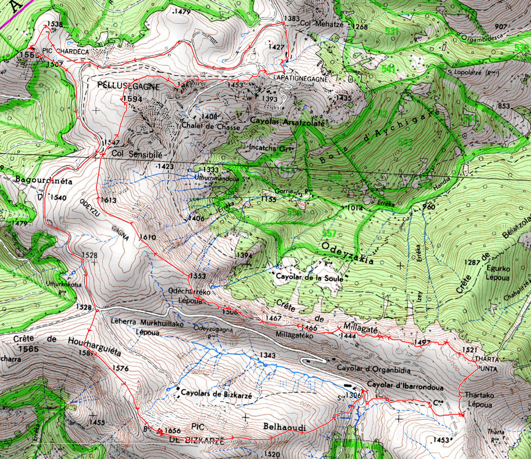 Thartako Lepoua 1436 m - Thartako Punta 1521 m - Odécharreko Lepoua 1490 m - Odeyzu Gagna 1613 m - Col Sensibilé 1547 m - Pelusegagne 1594 m - Col de Mehatzé 1383 m