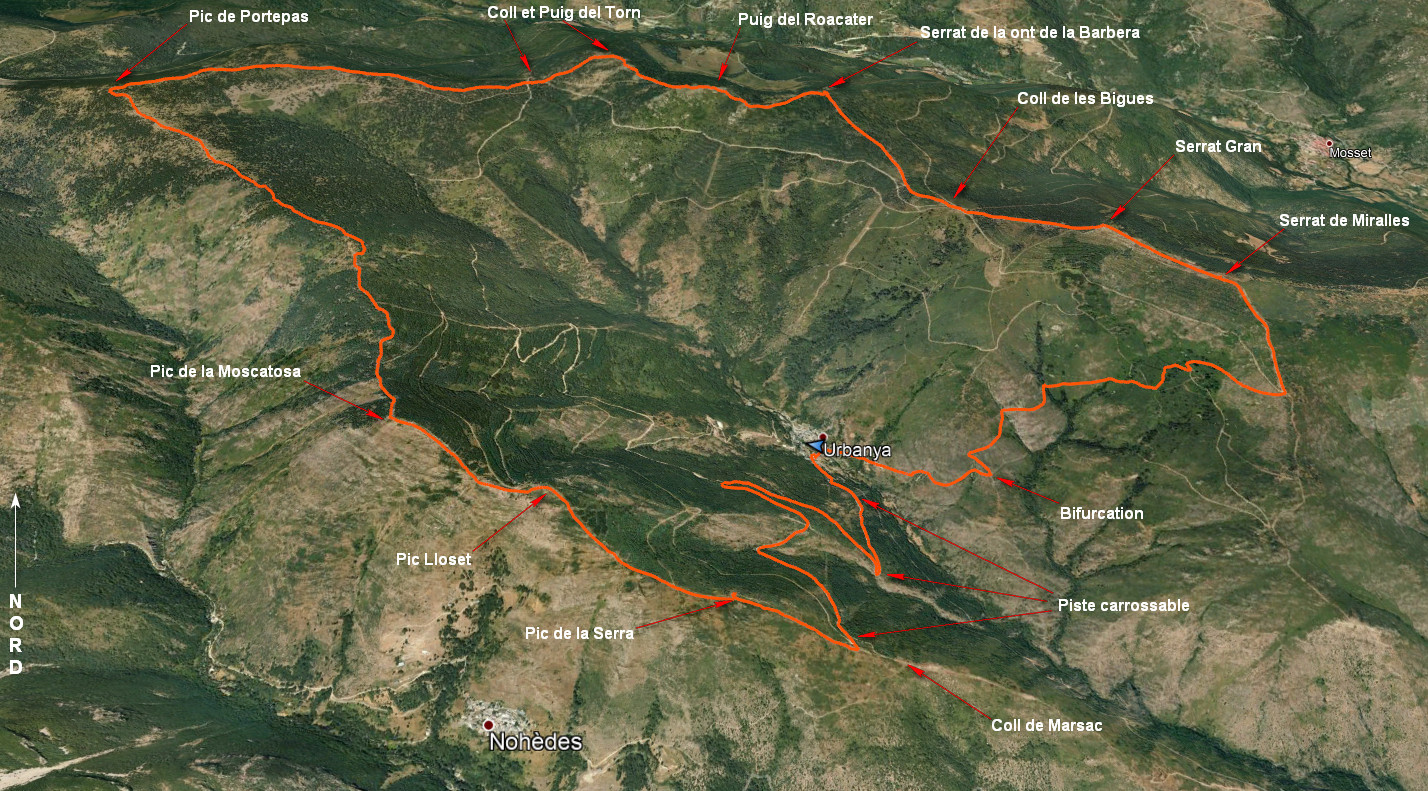Pic de la Moscatosa 1457 m - Pic Lloset 1371 m - Pic de la Serra 1208 m - Piste 1080 m - Urbanya 850 m