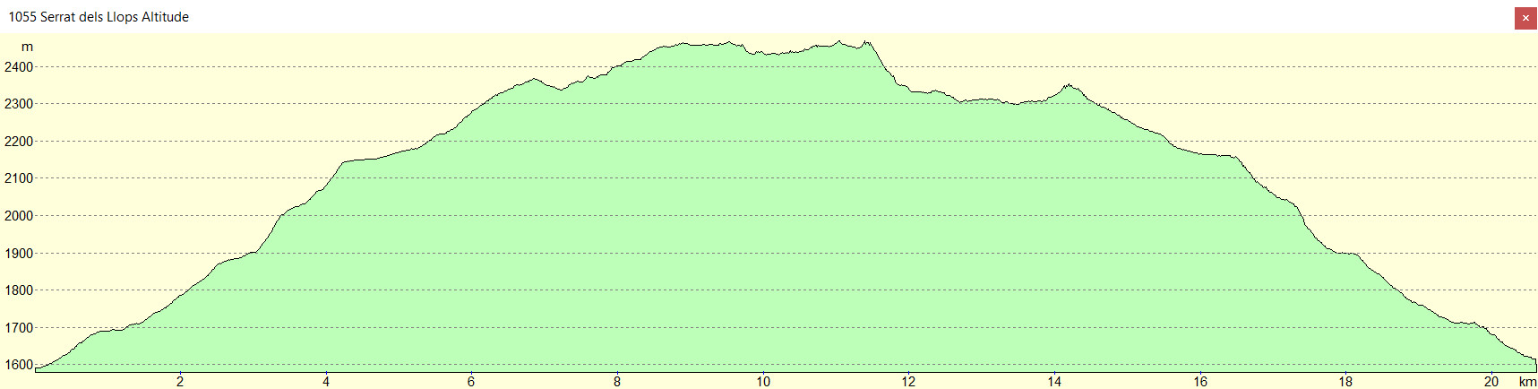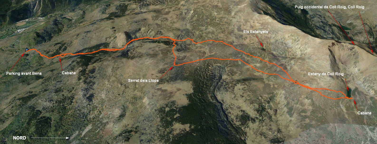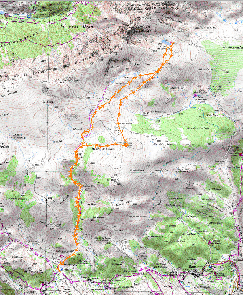 Parking Bena 1590 m - Cabane 1710 m - Pas de Maura 2372 m - Estany de Coll Roig 2432 m - Port de Maura 2300 m - Serrat dels Llops 2344 m -